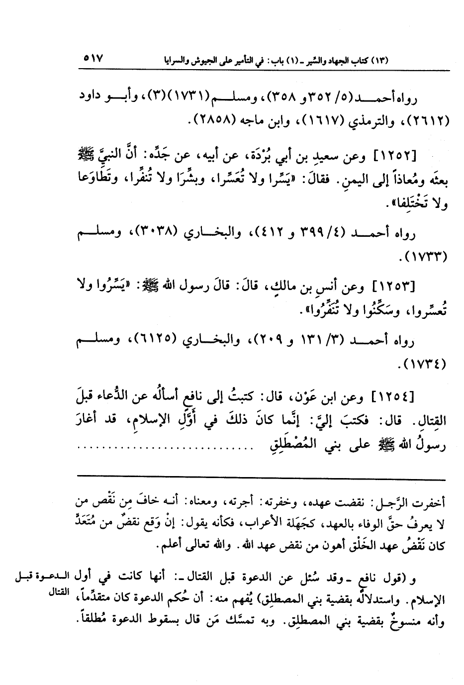 [1252] وعَن سَعِيدِ بنِ أَبِي بُردَةَ، عَن أَبِيهِ، عَن جَدِّهِ: أَنَّ النَّبِيَّ -صَلَّى اللَّهُ عَلَيهِ وَسَلَّمَ- بَعَثَهُ وَمُعَاذًا إِلَى اليَمَنِ، فَقَالَ: يَسِّرَا وَلَا تُعَسِّرَا، وَبَشِّرَا وَلَا تُنَفِّرَا، وَتَطَاوَعَا وَلَا تَختَلِفَا.
