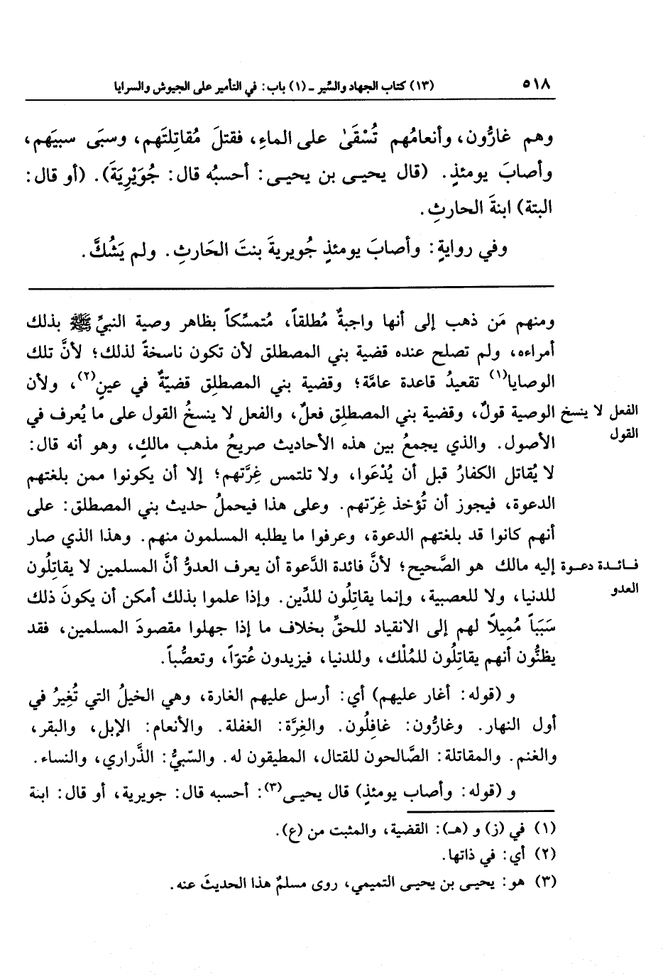 ومنهم من ذهب إلى أنها واجبة مطلقًا، متمسّكًا بظاهر وصية النبي - صلى الله عليه وسلم - بذلك أمراءه، ولم تصلح عنده قضية بني المصطلق لأن تكون ناسخة لذلك؛ لأن تلك الوصايا (¬1) تقعيد قاعدة عامة، وقضية بني المصطلق قضية في عين (¬2)؛ ولأن الوصية قول، وقضية بني المصطلق فعل، والفعل لا ينسخ القول على ما يُعرف في الأصول. والذي يجمع بين هذه الأحاديث صريح مذهب مالك، وهو أنه قال: لا يقاتل الكفار قبل أن يُدعَوا، ولا تلتمس غرّتهم، إلا أن يكونوا ممن بلغتهم الدعوة، فيجوز أن تؤخذ غرتهم. وعلى هذا فيحمل حديث بني المصطلق: على أنهم كانوا قد بلغتهم الدعوة، وعرفوا ما يطلبه المسلمون منهم. وهذا الذي صار إليه مالك هو الصحيح؛ لأن فائدة الدَّعوة أن يعرف العدو أن المسلمين لا يقاتلون للدنيا، ولا للعصبية، وإنما يقاتلون للدِّين. وإذا علموا بذلك أمكن أن يكون ذلك سببًا مُمِيلًا لهم إلى الانقياد للحق بخلاف ما إذا جهلوا مقصود المسلمين، فقد يظنون أنهم يقاتلون للملك، وللدنيا، فيزيدون عتوًّا، وتعصبًا.