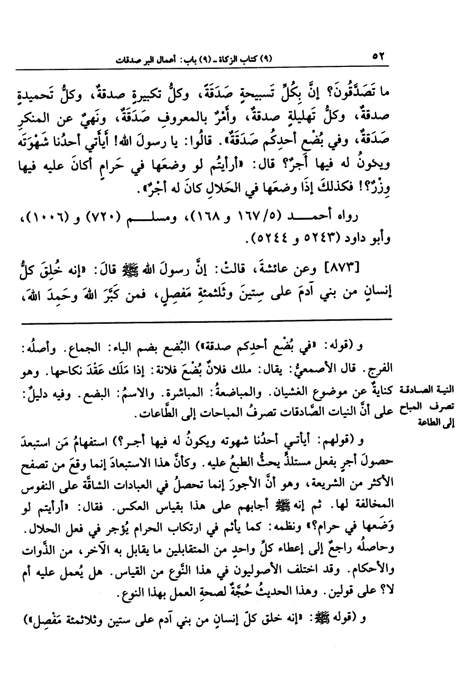 مَا تَصَّدَّقُونَ؟ إِنَّ بِكُلِّ تَسبِيحَةٍ صَدَقَةً، وَكُلِّ تَكبِيرَةٍ صَدَقَةً وَكُلِّ تَحمِيدَةٍ صَدَقَةً، وَكُلِّ تَهلِيلَةٍ صَدَقَةً، وَأَمرٌ بِالمَعرُوفِ صَدَقَةٌ، وَنَهيٌ عَن المُنكَرِ صَدَقَةٌ، وَفِي بُضعِ أَحَدِكُم صَدَقَةٌ). قَالُوا: يَا رَسُولَ اللهِ! أَيَأتِي أَحَدُنَا شَهوَتَهُ وَيَكُونُ لَهُ فِيهَا أَجرٌ؟ قَالَ: (أَرَأَيتُم لَو وَضَعَهَا فِي حَرَامٍ، أَكَانَ عَلَيهِ فِيهَا وِزرٌ؟ فَكَذَلِكَ إِذَا وَضَعَهَا فِي الحَلالِ كَانَ لَهُ أَجرٌ).