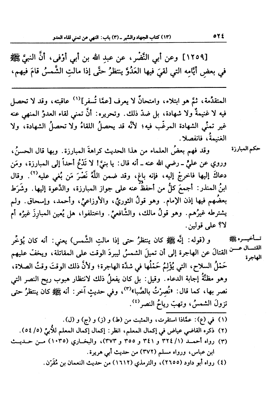 [1259] وعَن أَبِي النَّضرِ عن عَبدُ اللَّهِ بنُ أَبِي أَوفَى، أَنَّ النبي - صَلَّى اللَّهُ عَلَيهِ وَسَلَّمَ- كَانَ فِي بَعضِ أَيَّامِهِ الَّتِي لَقِيَ فِيهَا العَدُوَّ، يَنتَظِرُ حَتَّى إِذَا مَالَت الشَّمسُ قَامَ فِيهِم،