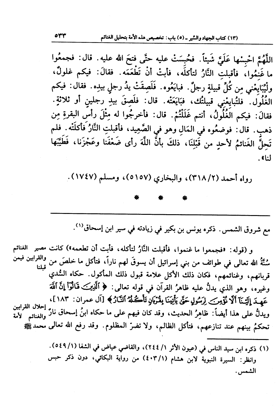 اللَّهُمَّ احبِسهَا عَلَيَّ شَيئًا، فَحُبِسَت عَلَيهِ حَتَّى فَتَحَ اللَّهُ عَلَيهِ. قَالَ: فَجَمَعُوا مَا غَنِمُوا، فَأَقبَلَت النَّارُ لِتَأكُلَهُ، فَأَبَت أَن تَطعَمَهُ، فَقَالَ: فِيكُم غُلُولٌ، وَليُبَايِعنِي مِن كُلِّ قَبِيلَةٍ رَجُلٌ، فَبَايَعُوهُ فَلَصِقَت يَدُ رَجُلٍ بِيَدِهِ، فَقَالَ: فِيكُم الغُلُولُ، فَلتُبَايِعنِي قَبِيلَتُكَ، فَبَايَعَتهُ، قَالَ: فَلَصِقَ بِيَدِ رَجُلَينِ أَو ثَلَاثَةٍ، فَقَالَ: فِيكُم الغُلُولُ، أَنتُم غَلَلتُم، قَالَ: فَأَخرَجُوا لَهُ مِثلَ رَأسِ البَقَرَةٍ مِن ذَهَبٍ، قَالَ: فَوَضَعُوهُ فِي المَالِ وَهُوَ في الصَّعِيدِ، فَأَقبَلَت النَّارُ فَأَكَلَتهُ، فَلَم تَحِلَّ الغَنَائِمُ لِأَحَدٍ مِن قَبلِنَا، ذَلِكَ بِأَنَّ اللَّهَ رَأَى ضَعفَنَا وَعَجزَنَا فَطَيَّبَهَا لَنَا.