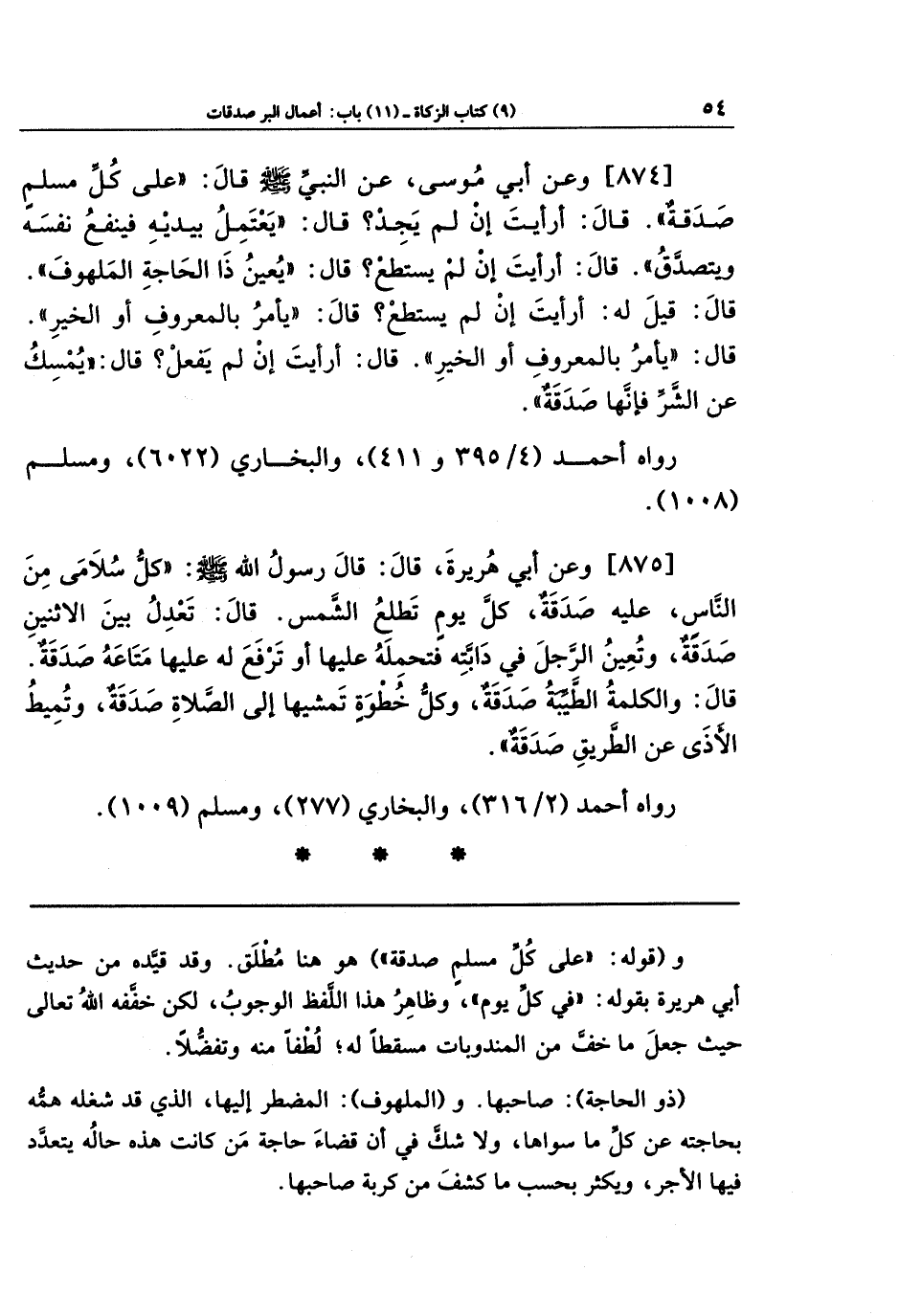 [875] وَعَن أَبِي هُرَيرَةَ قَالَ: قَالَ رَسُولِ اللهِ - صلى الله عليه وسلم -: كُلُّ سُلامَى مِنَ النَّاسِ، عَلَيهِ صَدَقَةٌ، كُلَّ يَومٍ تَطلُعُ الشَّمسُ. قَالَ: تَعدِلُ بَينَ الاثنَينِ صَدَقَةٌ، وَتُعِينُ الرَّجُلَ فِي دَابَّتِهِ فَتَحمِلُهُ عَلَيهَا أَو تَرفَعُ لَهُ عَلَيهَا مَتَاعَهُ صَدَقَةٌ، قَالَ: وَالكَلِمَةُ الطَّيِّبَةُ صَدَقَةٌ، وَكُلُّ خُطوَةٍ تَمشِيهَا إِلَى الصَّلاةِ صَدَقَةٌ. وَتُمِيطُ الأَذَى عَنِ الطَّرِيقِ صَدَقَةٌ.