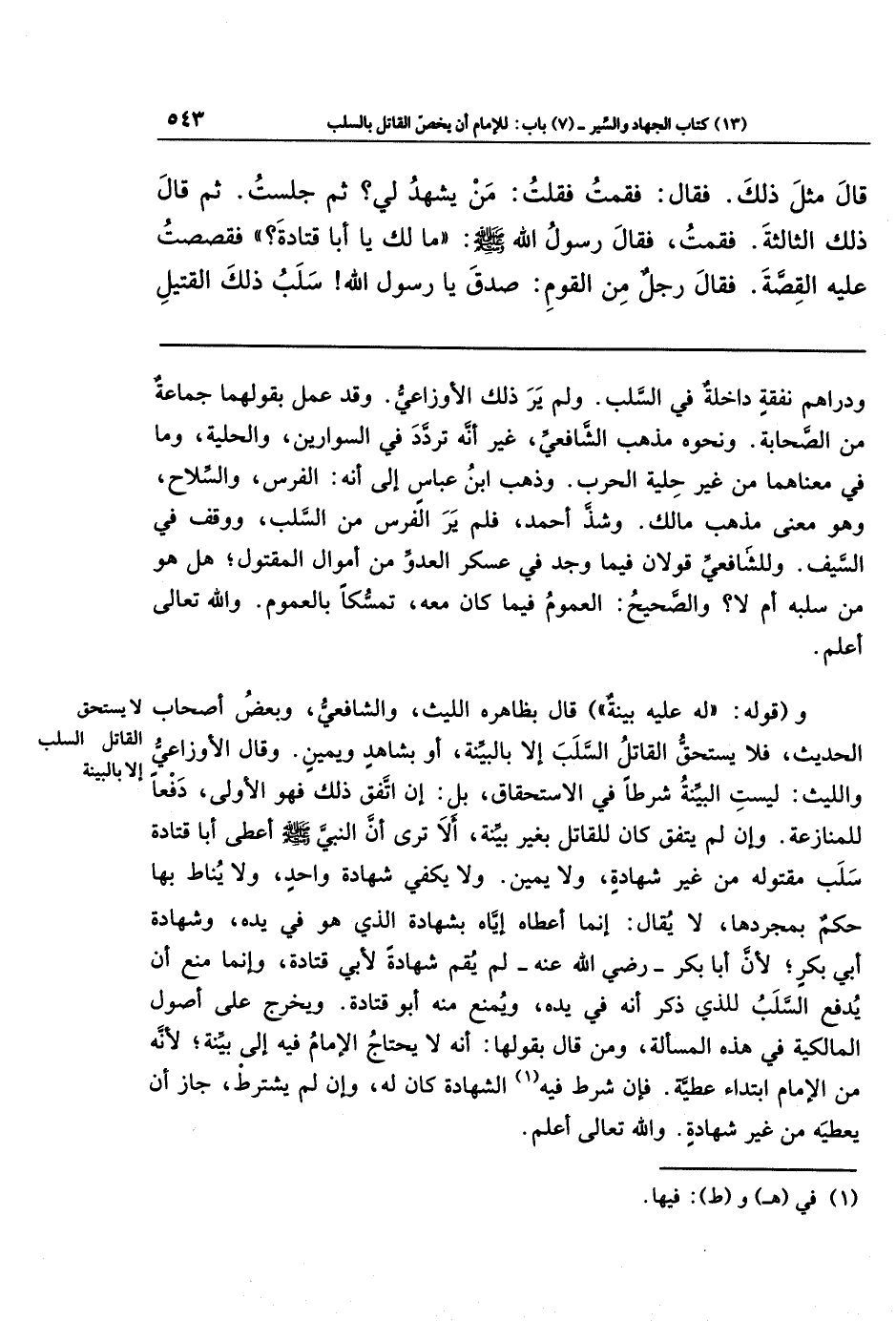 ودراهم نفقة داخلة في السَّلب. ولم ير ذلك الأوزاعي. وقد عمل بقولهما جماعة من الصحابة. ونحوه مذهب الشافعي، غير أنه تردد في السوارين، والحلية، وما في معناهما من غير حلية الحرب.