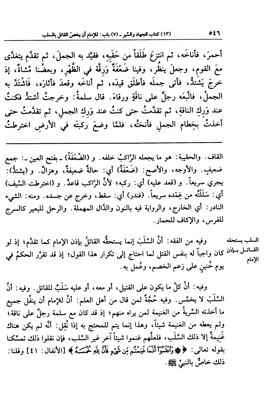 وفيه حجة لمن قال من أهل العلم: أن للإمام أن ينفل جميع ما أخذته السَّرية من الغنيمة لمن يراه منهم؛ إذ قد كان مع سلمة رجل على ناقة؛ ولم يعطه من الغنيمة شيئًا، وهذا إنما يتم للمحتج به إذا نقل: أنه لم يكن هناك غنيمة إلا ذلك السَّلب، فلعلهم غنموا شيئًا آخر غير السَّلب، فإن نقلوا ذلك تمسّكنا بقوله تعالى: {وَاعلَمُوا أَنَّمَا غَنِمتُم مِن شَيءٍ فَأَنَّ لِلَّهِ خُمُسَهُ} وقلنا: ذلك خاص بالنبي - صلى الله عليه وسلم -.