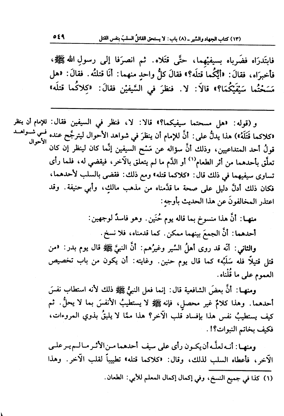 ومنها: أنه لعله أن يكون رأى على سيف أحدهما من الأثر ما لم ير على الآخر، فأعطاه السلب لذلك، وقال: (كلاكما قتله) تطييبًا لقلب الآخر. وهذا