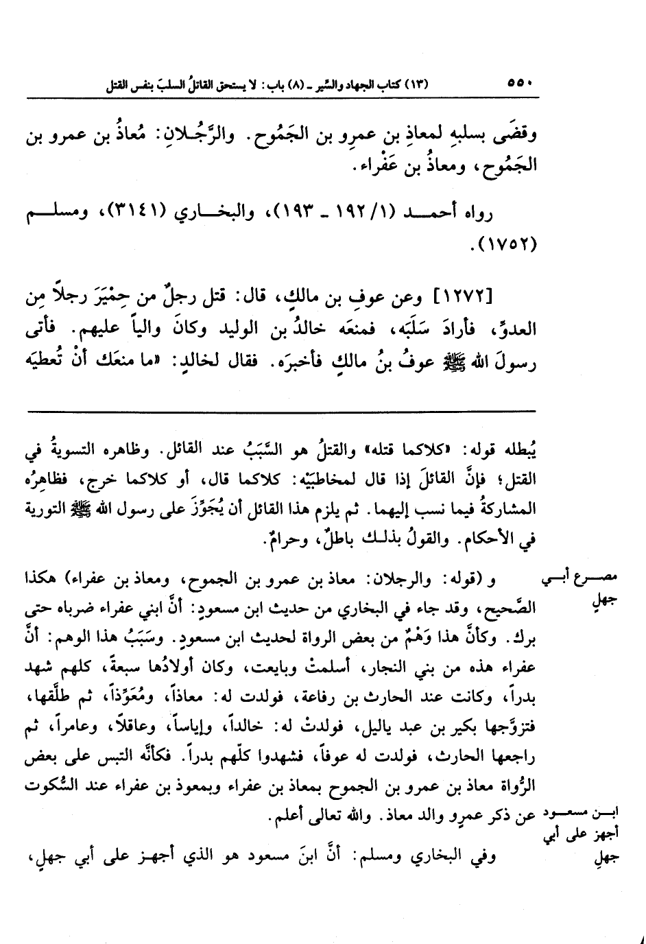وَقَضَى بِسَلَبِهِ لِمُعَاذِ بنِ عَمرِو بنِ الجَمُوحِ، وَالرَّجُلَانِ: مُعَاذُ بنُ عَمرِو بنِ الجَمُوحِ، وَمُعَاذُ بنُ عَفرَاءَ.