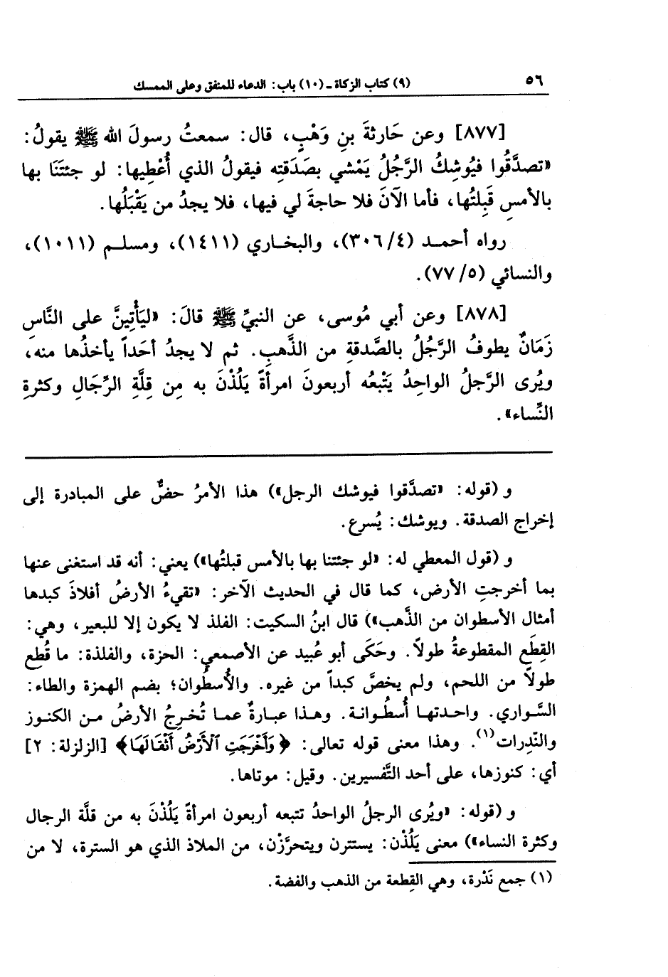 [877] وَعَن حَارِثَةَ بنِ وَهبٍ قَالَ: سَمِعتُ رَسُولَ اللهِ - صلى الله عليه وسلم - يَقُولُ: (تَصَدَّقُوا فَيُوشِكُ الرَّجُلُ يَمشِي بِصَدَقَتِهِ فَيَقُولُ الَّذِي أُعطِيَهَا: لَو جِئتَنَا بِهَا بِالأَمسِ قَبِلتُهَا، فَأَمَّا الآنَ فَلا حَاجَةَ لِي فِيهَا، فَلا يَجِدُ مَن يَقبَلُهَا).