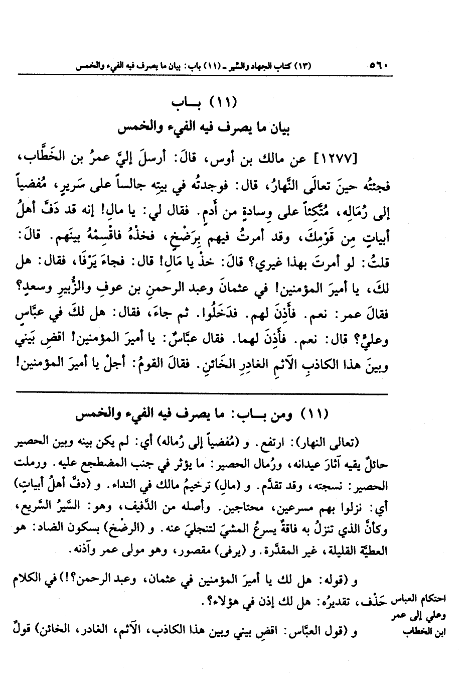[1277] عن مَالِكَ بنَ أَوسٍ قَالَ: أَرسَلَ إِلَيَّ عُمَرُ بنُ الخَطَّابِ، فَجِئتُهُ حِينَ تَعَالَى النَّهَارُ قَالَ: فَوَجَدتُهُ فِي بَيتِهِ جَالِسًا عَلَى سَرِيرٍ، مُفضِيًا إِلَى رُمَالِهِ، مُتَّكِئًا عَلَى وِسَادَةٍ مِن أَدَمٍ، فَقَالَ لِي: يَا مَالُ! إِنَّهُ قَد دَفَّ أَهلُ أَبيَاتٍ مِن قَومِكَ، وَقَد أَمَرتُ فِيهِم بِرَضخٍ، فَخُذهُ فَاقسِمهُ بَينَهُم. قَالَ: قُلتُ: لَو أَمَرتَ بِهَذَا غَيرِي؟ قَالَ: خُذ يَا مَالُ! قَالَ: فَجَاءَ يَرفَا فَقَالَ: هَل لك يَا أَمِيرَ المُؤمِنِينَ! فِي عُثمَانَ، وَعَبدِ الرَّحمَنِ بنِ عَوفٍ، وَالزُّبَيرِ، وَسَعدٍ؟ فَقَالَ عُمَرُ: نَعَم، فَأَذِنَ لَهُم، فَدَخَلُوا، ثُمَّ جَاءَ فَقَالَ: هَل لك فِي عَبَّاسٍ، وَعَلِيٍّ؟ قَالَ: نَعَم، فَأَذِنَ لَهُمَا، فَقَالَ عَبَّاسٌ: يَا أَمِيرَ المُؤمِنِينَ! اقضِ بَينِي وَبَينَ هَذَا الكَاذِبِ الآثِمِ الغَادِرِ الخَائِنِ، فَقَالَ القَومُ: أَجَل يَا أَمِيرَ المُؤمِنِينَ!