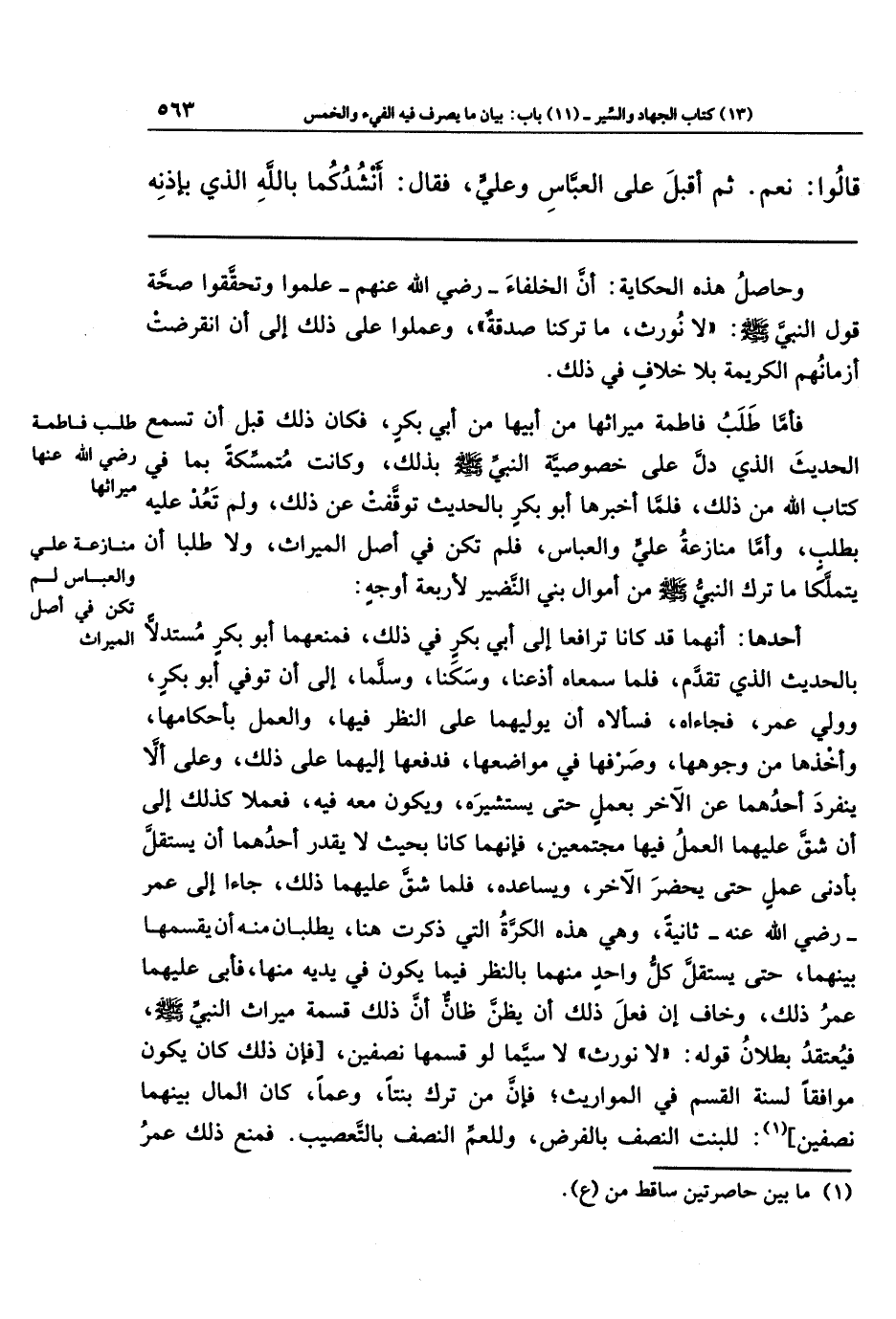 وحاصل هذه الحكاية: أن الخلفاء رضي الله عنهم علموا وتحققوا صحَّة قول النبي - صلى الله عليه وسلم -: (لا نورث، ما تركنا صدقة)، وعملوا على ذلك إلى أن انقرضت أزمانهم الكريمة بلا خلاف في ذلك.