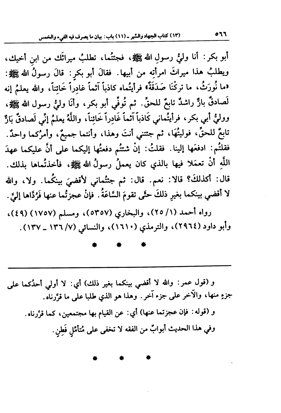 أَبُو بَكرٍ: أَنَا وَلِيُّ رَسُولِ اللَّهِ-صَلَّى اللَّهُ عَلَيهِ وَسَلَّمَ-، فَجِئتُمَا تَطلُبُ مِيرَاثَكَ مِن ابنِ أَخِيكَ، وَيَطلُبُ هَذَا مِيرَاثَ امرَأَتِهِ مِن أَبِيهَا، فَقَالَ أَبُو بَكرٍ: قَالَ رَسُولُ اللَّهِ -صَلَّى اللَّهُ عَلَيهِ وَسَلَّمَ-: مَا نُورَثُ، مَا تَرَكنَا صَدَقَةٌ. فَرَأَيتُمَاهُ كَاذِبًا آثِمًا غَادِرًا خَائِنًا، وَاللَّهُ يَعلَمُ إِنَّهُ لَصَادِقٌ بَارٌّ رَاشِدٌ تَابِعٌ لِلحَقِّ، ثُمَّ تُوُفِّيَ أَبُو بَكرٍ وَأَنَا وَلِيُّ رَسُولِ اللَّهِ -صَلَّى اللَّهُ عَلَيهِ وَسَلَّمَ-، وَوَلِيُّ أَبِي بَكرٍ، فَرَأَيتُمَانِي كَاذِبًا آثِمًا غَادِرًا خَائِنًا، وَاللَّهُ يَعلَمُ إِنِّي لَصَادِقٌ بَارٌّ تَابِعٌ لِلحَقِّ فَوَلِيتُهَا، ثُمَّ جِئتَنِي أَنتَ وَهَذَا وَأَنتُمَا جَمِيعٌ، وَأَمرُكُمَا وَاحِدٌ، فَقُلتُم: ادفَعهَا إِلَينَا، فَقُلتُ: إِن شِئتُم دَفَعتُهَا إِلَيكُمَا عَلَى أَنَّ عَلَيكُمَا عَهدَ اللَّهِ أَن تَعمَلَا فِيهَا بِالَّذِي كَانَ يَعمَلُ رَسُولُ اللَّهِ -صَلَّى اللَّهُ عَلَيهِ وَسَلَّمَ-، فَأَخَذتُمَاهَا بِذَلِكَ، قَالَ: أَكَذَلِكَ؟ قَالَا: نَعَم، قَالَ: ثُمَّ جِئتُمَانِي لِأَقضِيَ بَينَكُمَا، وَلَا وَاللَّهِ لَا أَقضِي بَينَكُمَا بِغَيرِ ذَلِكَ حَتَّى تَقُومَ السَّاعَةُ، فَإِن عَجَزتُمَا عَنهَا فَرُدَّاهَا إِلَيَّ.