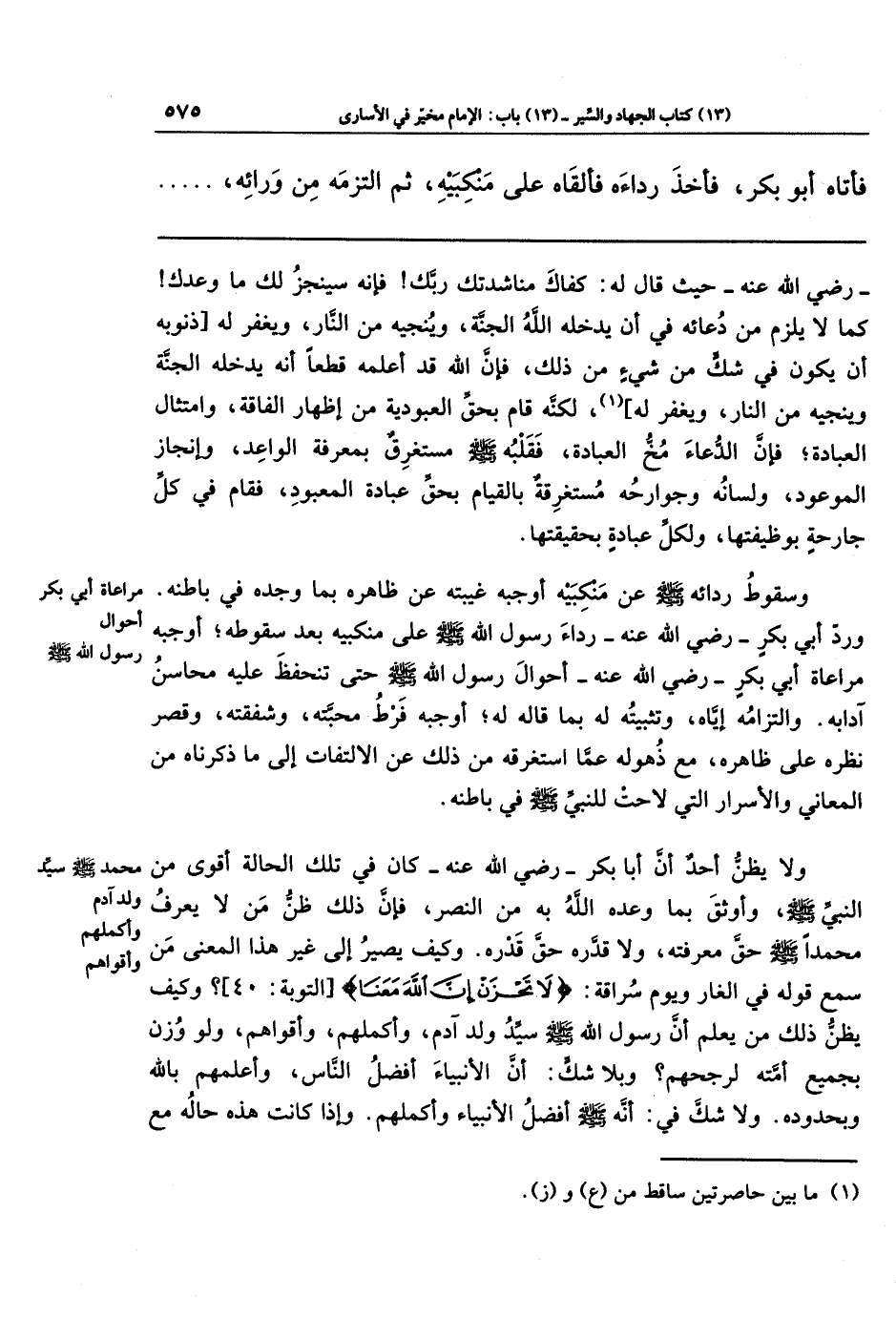 ولا يظن أحدٌ أن أبا بكر رضي الله عنه كان في تلك الحالة أقوى من النبي - صلى الله عليه وسلم - وأوثق بما وعده الله به من النصر، فإن ذلك ظن من لا يعرف محمدا - صلى الله عليه وسلم - حق معرفته، ولا قدره حق قدره. وكيف يصير إلى غير هذا المعنى من سمع قوله في الغار ويوم سراقة: لَا تَحزَن إِنَّ اللَّهَ مَعَنَا، وكيف يظن ذلك من يعلم أن رسول الله - صلى الله عليه وسلم - سيد ولد آدم، وأكملهم وأقواهم، ولو وزن بجميع أمته لرجحهم؟ وبلا شك أن الأنبياء أفضل الناس، وأعلمهم بالله وبحدوده. ولا شك في: أنه - صلى الله عليه وسلم - أفضل الأنبياء وأكملهم. وإذا كانت هذه حاله مع
