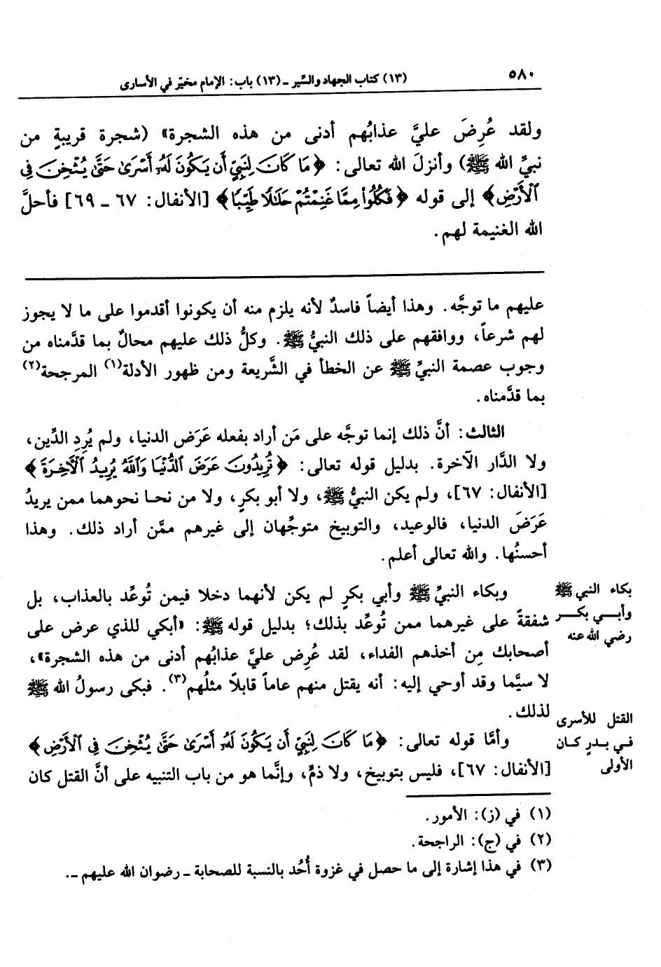 وبكاء النبي - صلى الله عليه وسلم - وأبي بكر لم يكن لأنهما دخلا فيمن توعد بالعذاب، بل شفقة على غيرهما ممن توعد بذلك؛ بدليل قوله - صلى الله عليه وسلم -: (أبكي للذي عرض عليّ أصحابك من أخذهم الفداء، لقد عرض علي عذابهم أدنى من هذه الشجرة)، لا سيما وقد أوحي إليه: أنه يقتل منهم عامًا قابلًا مثلهم (¬3). فبكى رسول الله - صلى الله عليه وسلم - لذلك.
