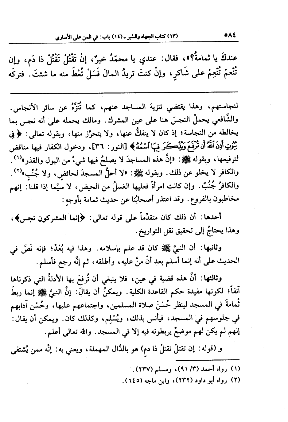 وثالثها: أن هذه قضية في عين، فلا ينبغي أن ترفع بها الأدلة التي ذكرناها آنفًا؛ لكونها مفيدة حكم القاعدة الكلية. ويمكن أن يقال: إن النبي - صلى الله عليه وسلم - إنما ربط ثمامة في المسجد لينظر حسن صلاة المسلمين، واجتماعهم عليها، وحسن آدابهم في جلوسهم في المسجد، فيأنسَّ بذلك ويسلم، وكذلك كان. ويمكن أن يقال: إنهم لم يكن لهم موضع يربطونه فيه إلا في المسجد. والله تعالى أعلم.