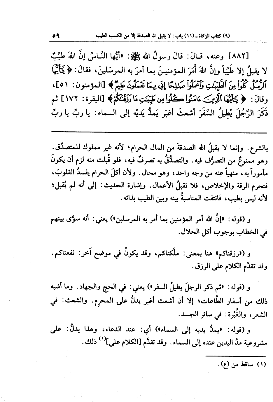 [882] وَعَنهُ قَالَ: قَالَ رَسُولُ اللهِ - صلى الله عليه وسلم -: (أَيُّهَا النَّاسُ إِنَّ اللهَ طَيِّبٌ لا يَقبَلُ إِلا طَيِّبًا، وَإِنَّ اللهَ أَمَرَ المُؤمِنِينَ بِمَا أَمَرَ بِهِ المُرسَلِينَ، فَقَالَ: {يَا أَيُّهَا الرُّسُلُ كُلُوا مِنَ الطَّيِّبَاتِ وَاعمَلُوا صَالِحًا إِنِّي بِمَا تَعمَلُونَ عَلِيمٌ} وَقَالَ: {يَا أَيُّهَا الَّذِينَ آمَنُوا كُلُوا مِن طَيِّبَاتِ مَا رَزَقنَاكُم} ثُمَّ ذَكَرَ الرَّجُلَ يُطِيلُ السَّفَرَ أَشعَثَ أَغبَرَ يَمُدُّ يَدَيهِ إِلَى السَّمَاءِ يَا رَبِّ يَا رَبِّ