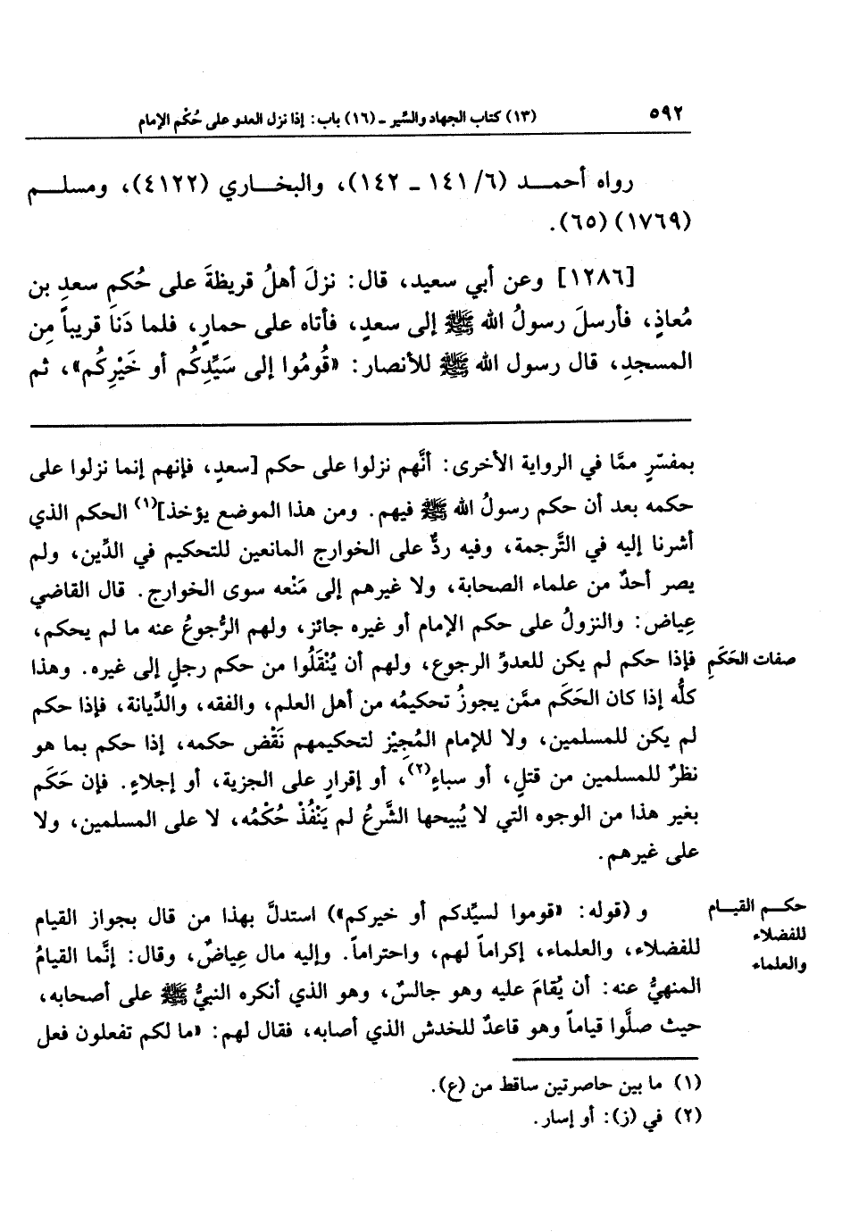 [1286] وعن أبي سَعِيدٍ قَالَ: نَزَلَ أَهلُ قُرَيظَةَ عَلَى حُكمِ سَعدِ بنِ مُعَاذٍ، فَأَرسَلَ رَسُولُ اللَّهِ -صَلَّى اللَّهُ عَلَيهِ وَسَلَّمَ- إِلَى سَعدٍ، فَأَتَاهُ عَلَى حِمَارٍ، فَلَمَّا دَنَا قَرِيبًا مِن المَسجِدِ، قَالَ رَسُولُ اللَّهِ -صَلَّى اللَّهُ عَلَيهِ وَسَلَّمَ- لِلأَنصَارِ: قُومُوا إِلَى سَيِّدِكُم، (أَو خَيرِكُم)، ثُمَّ