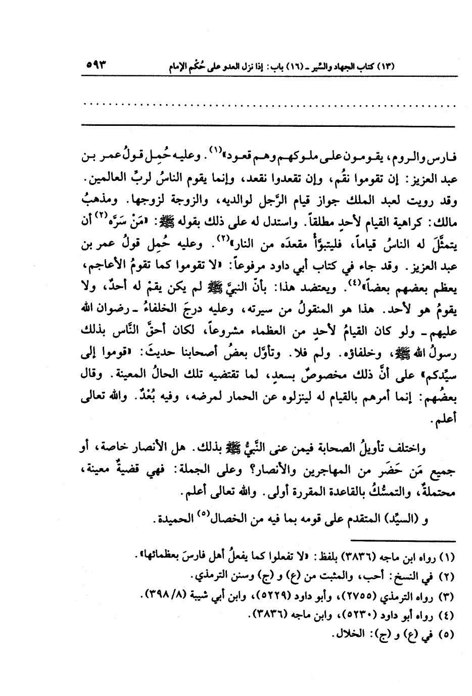 فارس والروم، يقومون على ملوكهم وهم قعود) (¬1). وعليه حمل قول عمر بن عبد العزيز: إن تقوموا نقم، وإن تقعدوا نقعد، وإنما يقوم الناس لرب العالمين. وقد رويت لعبد الملك جواز قيام الرجل لوالديه، والزوجة لزوجها. ومذهب مالك: كراهية القيام لأحد مطلقًا. واستدل له على ذلك بقوله -صلى الله عليه وسلم-: (من سرَّه (¬2) أن يتمثل له الناس قيامًا، فليتبوأ مقعده من النار) (¬3). وعليه حمل قول عمر بن عبد العزيز. وقد جاء في كتاب أبي داود مرفوعًا: (لا تقوموا كما تقوم الأعاجم، يعظم بعضهم بعضًا) (¬4). ويعتضد هذا: بأن النبي -صلى الله عليه وسلم- لم يكن يقم له أحد، ولا يقوم هو لأحد. هذا هو المنقول من سيرته، وعليه درج الخلفاء رضوان الله عليهم، ولو كان القيام لأحد من العظماء مشروعًا، لكان أحق الناس بذلك رسول الله -صلى الله عليه وسلم- وخلفاؤه. ولم فلا.