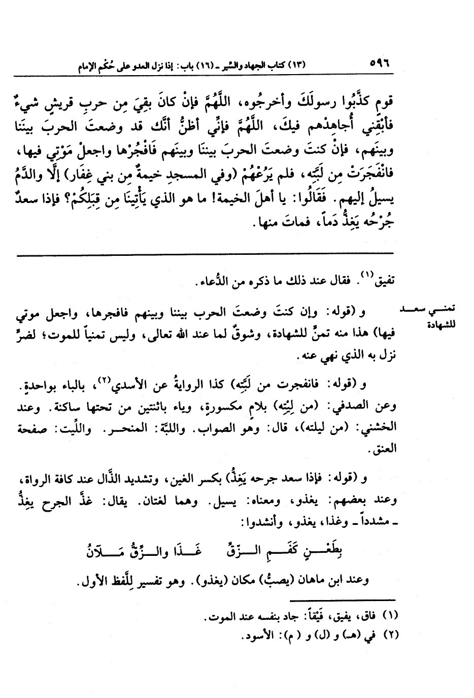 قَومٍ كَذَّبُوا رَسُولَكَ وَأَخرَجُوهُ، اللَّهُمَّ فَإِن كَانَ بَقِيَ مِن حَربِ قُرَيشٍ شَيءٌ فَأَبقِنِي أُجَاهِدهُم فِيكَ، اللَّهُمَّ فَإِنِّي أَظُنُّ أَنَّكَ قَد وَضَعتَ الحَربَ بَينَنَا وَبَينَهُم، فَإِن كُنتَ وَضَعتَ الحَربَ بَينَنَا وَبَينَهُم فَافجُرهَا وَاجعَل مَوتِي فِيهَا. فَانفَجَرَت مِن لَبَّتِهِ، فَلَم يَرُعهُم - وَفِي المَسجِدِ خَيمَةٌ مِن بَنِي غِفَارٍ - إِلَّا وَالدَّمُ يَسِيلُ إِلَيهِم، فَقَالَوا: يَا أَهلَ الخَيمَةِ! مَا هَو الَّذِي يَأتِينَا مِن قِبَلِكُم؟ فَإِذَا سَعدٌ جُرحُهُ يَغِذُّ دَمًا، فَمَاتَ مِنهَا.