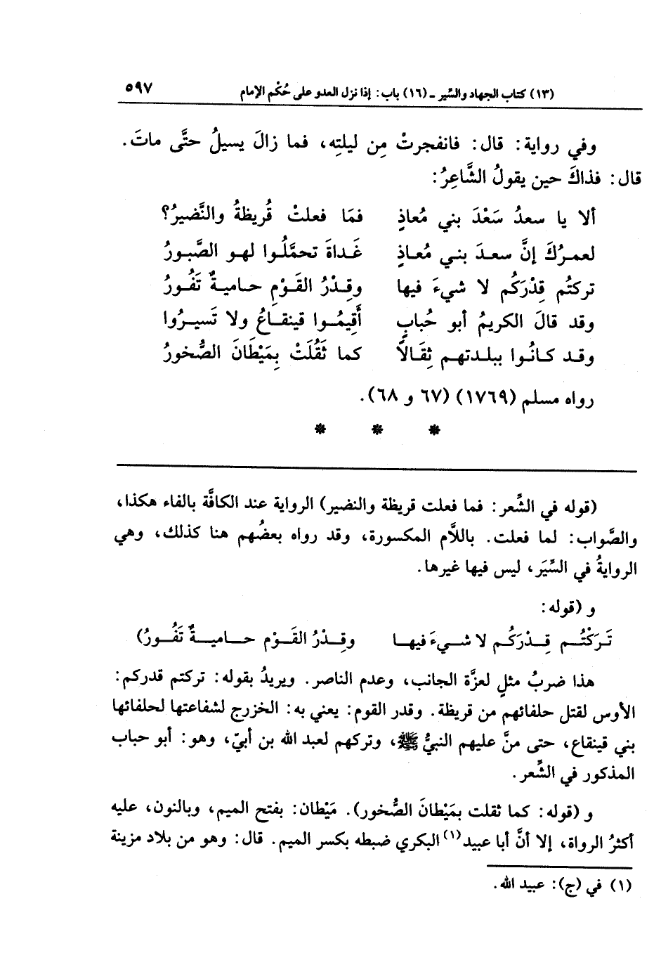 قوله في الشعر: (فما فعلت قريظة والنضير)؛ الرواية عند الكافة بالفاء هكذا، والصواب: (لما فعلت) باللام المكسورة، وقد رواه بعضهم هنا كذلك، وهي الرواية في السير، ليس فيها غيرها.