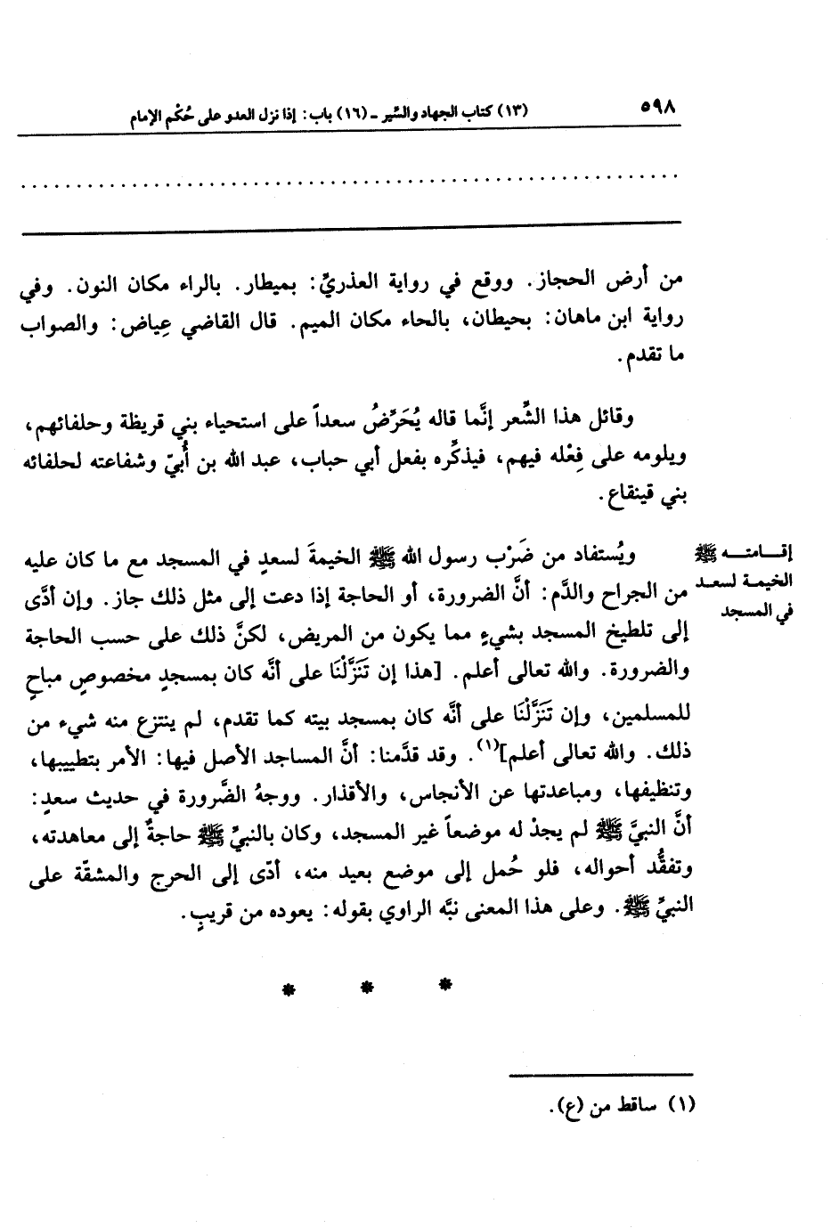 ويستفاد من ضرب رسول الله -صلى الله عليه وسلم- الخيمة لسعد في المسجد مع ما كان عليه من الجراح والدَّم: أن الضرورة، أو الحاجة إذا دعت إلى مثل ذلك جاز. وإن أدى إلى تلطيخ المسجد بشيء مما يكون من المريض، لكن ذلك على حسب الحاجة والضرورة. والله تعالى أعلم. هذا إن تنزلنا على أنه كان بمسجد مخصوص مباح للمسلمين، وإن تنزلنا على أنه كان بمسجد بيته كما تقدم، لم ينتزع منه شيء من ذلك. والله تعالى أعلم (¬1).