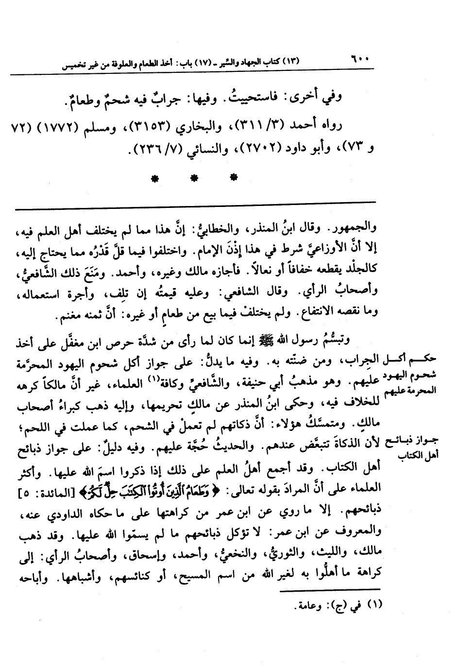 وفيه دليل: على جواز ذبائح أهل الكتاب. وقد أجمع أهل العلم على ذلك إذا ذكروا اسم الله عليها. وأكثر العلماء على أن المراد بقوله تعالى: {وَطَعَامُ الَّذِينَ أُوتُوا الكِتَابَ حِلٌّ لَكُم} ذبائحهم، إلا ما روي عن ابن عمر من كراهتها على ما حكاه الداودي عنه، والمعروف عن ابن عمر: لا تؤكل ذبائحهم ما لم يسمُّوا الله عليها. وقد ذهب مالك، والليث، والثوري، والنخعي، وأحمد، وإسحاق، وأصحاب الرأي: إلى كراهة ما أهلّوا به لغير الله من اسم المسيح، أو كنائسهم، وأشباهها. وأباحه