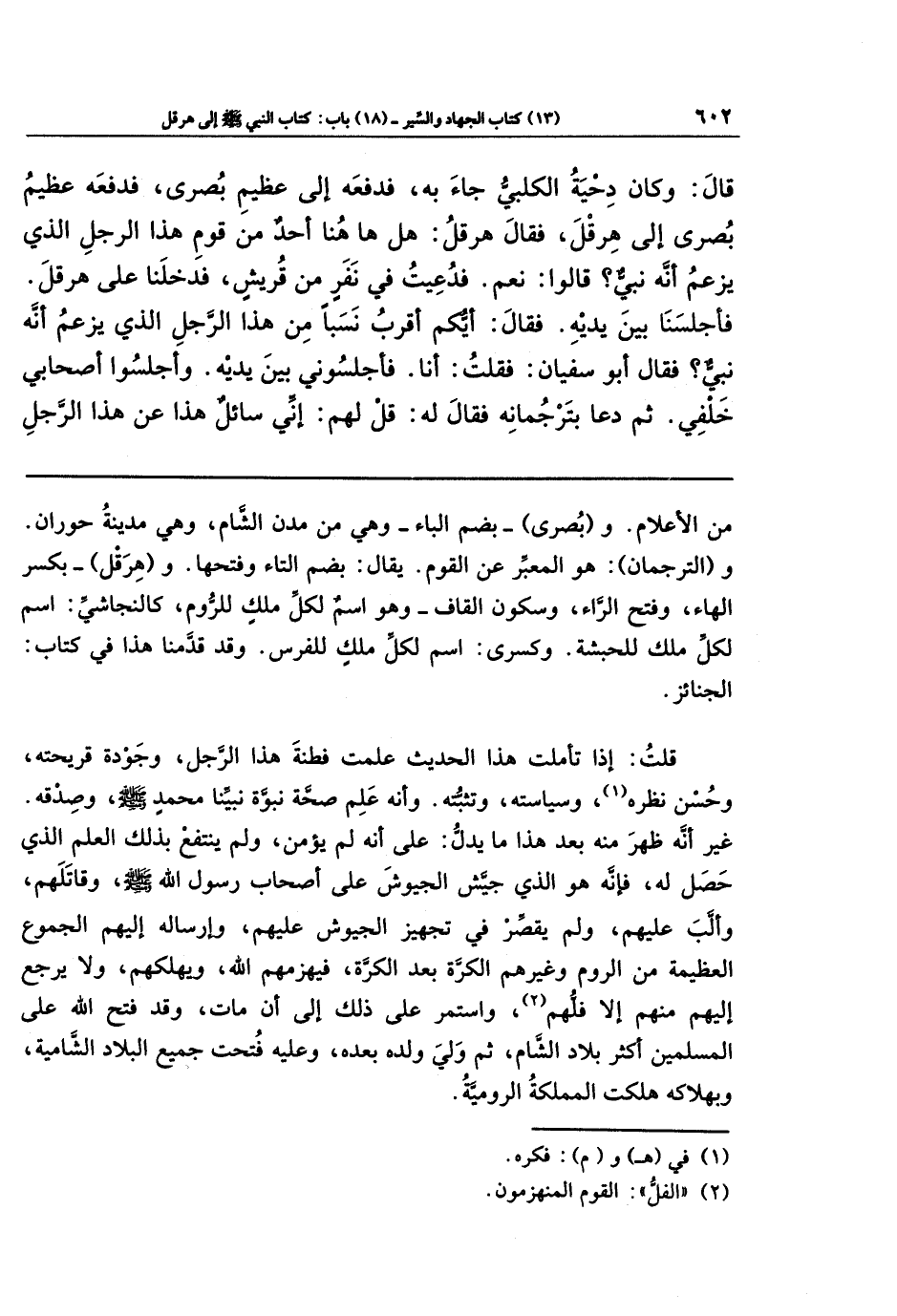 و(بُصرى) - بضم الباء-: وهي من مدن الشام، وهي مدينة حوران. و (الترجمان): هو المعبِّر عن القوم. يقال: بضم التاء وفتحها. و (هرقل) - بكسر الهاء، وفتح الراء، وسكون القاف-: وهو اسم لكل ملك للروم، كالنجاشي: اسم لكل ملك للحبشة. وكسرى: اسم لكل ملك للفرس. وقد قدَّمنا هذا في كتاب: الجنائز.