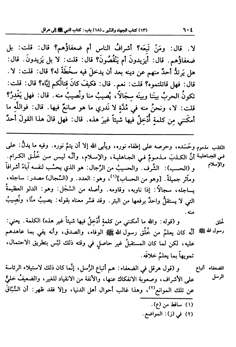 لَا، قَالَ: وَمَن تَبِعُهُ؟ أَشرَافُ النَّاسِ أَم ضُعَفَاؤُهُم؟ قَالَ: قُلتُ: بَل ضُعَفَاؤُهُم، قَالَ: أَيَزِيدُونَ أَم يَنقُصُونَ؟ قَالَ: قُلتُ: لَا بَل يَزِيدُونَ، قَالَ: هَل يَرتَدُّ أَحَدٌ مِنهُم عَن دِينِهِ بَعدَ أَن يَدخُلَ فِيهِ سَخطَةً لَهُ؟ قَالَ: قُلتُ: لَا، قَالَ: فَهَل قَاتَلتُمُوهُ؟ قُلتُ: نَعَم، قَالَ: فَكَيفَ كَانَ قِتَالُكُم إِيَّاهُ؟ قَالَ: قُلتُ: تَكُونُ الحَربُ بَينَنَا وَبَينَهُ سِجَالًا، يُصِيبُ مِنَّا وَنُصِيبُ مِنهُ، قَالَ: فَهَل يَغدِرُ؟ قُلتُ: لَا، وَنَحنُ مِنهُ فِي مُدَّةٍ لَا نَدرِي مَا هُوَ صَانِعٌ فِيهَا، قَالَ: فَوَاللَّهِ مَا أَمكَنَنِي مِن كَلِمَةٍ أُدخِلُ فِيهَا شَيئًا غَيرَ هَذِهِ، قَالَ: فَهَل قَالَ هَذَا القَولَ أَحَدٌ