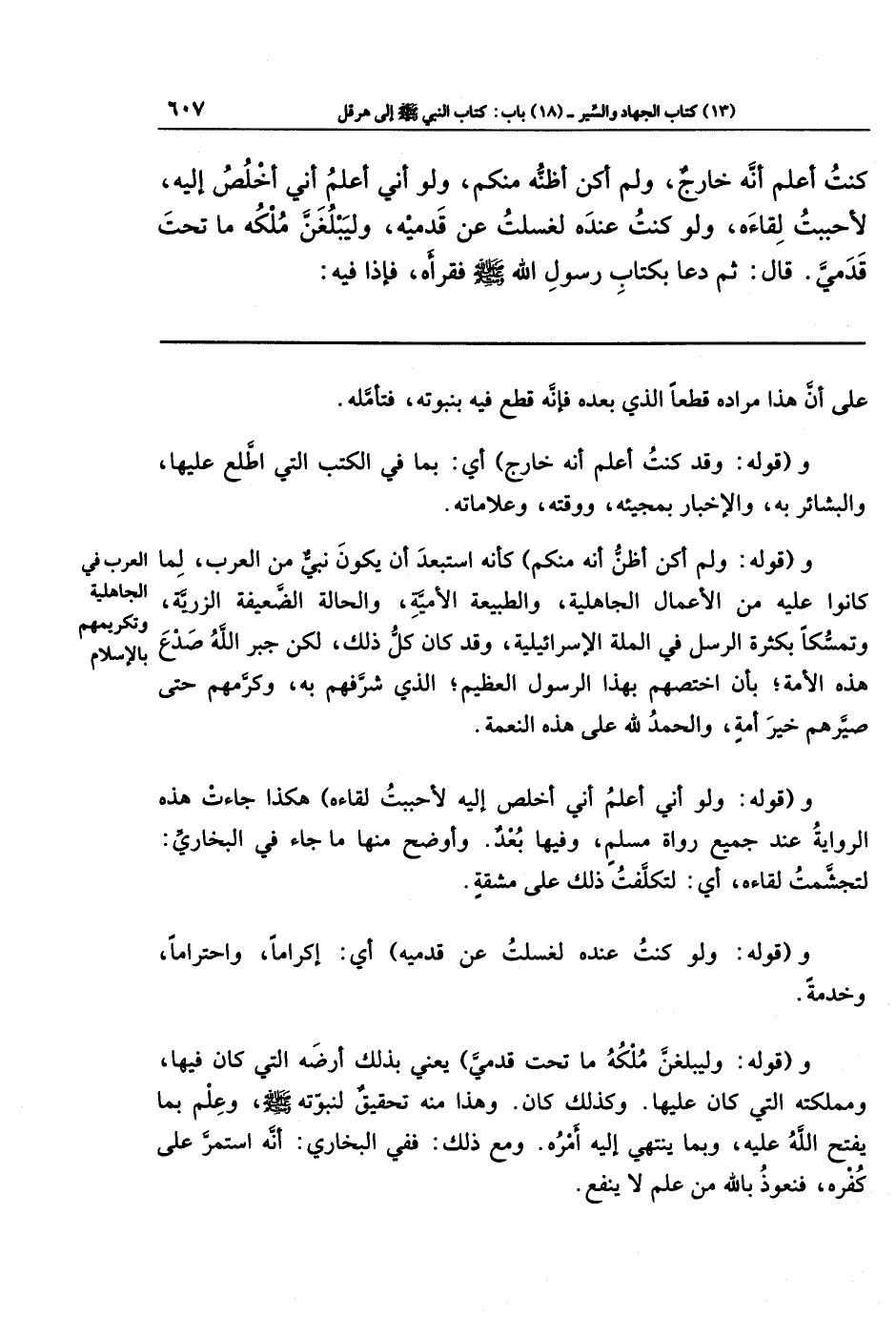 كُنتُ أَعلَمُ أَنَّهُ خَارِجٌ، وَلَم أَكُن أَظُنُّهُ مِنكُم، وَلَو أَنِّي أَعلَمُ أَنِّي أَخلُصُ إِلَيهِ، لَأَحبَبتُ لِقَاءَهُ، وَلَو كُنتُ عِندَهُ لَغَسَلتُ عَن قَدَمَيهِ، وَلَيَبلُغَنَّ مُلكُهُ مَا تَحتَ قَدَمَيَّ. قَالَ: ثُمَّ دَعَا بِكِتَابِ رَسُولِ اللَّهِ -صَلَّى اللَّهُ عَلَيهِ وَسَلَّمَ- فَقَرَأَهُ فَإِذَا فِيهِ: