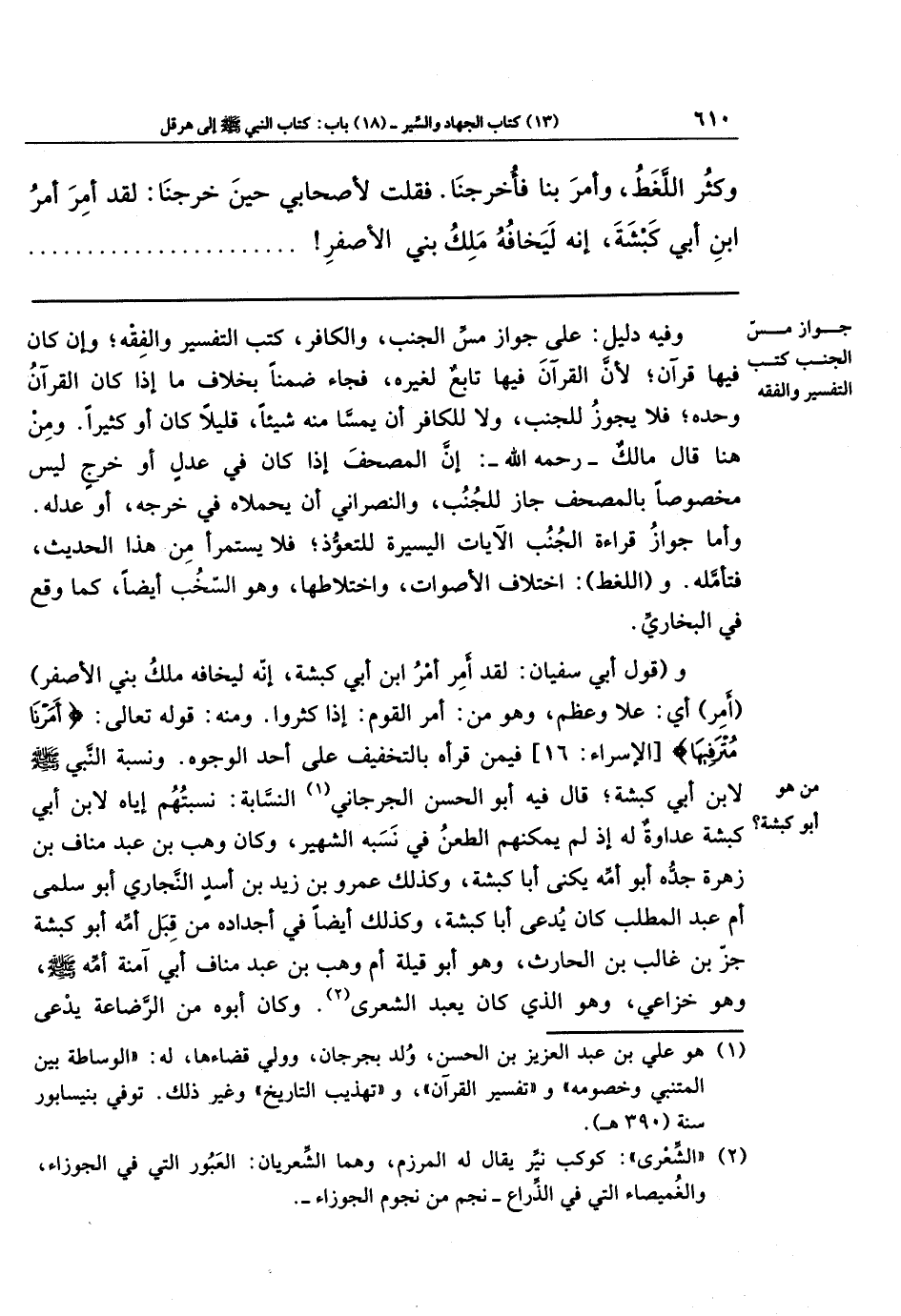 وقول أبي سفيان: لقد أمر أمر ابن أبي كبشة، إنه ليخافه ملك بني الأصفر أمر أي: علا وعظم، وهو من: أمر القوم: إذا كثروا، ومنه قوله تعالى: {أَمَرنَا مُترَفِيهَا} فيمن قرأه بالتخفيف على أحد الوجوه، ونسبة النبي - صلى الله عليه وسلم - لابن أبي كبشة، قال فيه أبو الحسن الجرجاني (¬1) النسابة: نسبتهم إياه لابن أبي كبشة عداوة له إذ لم يمكنهم الطعن في نسبه الشهير، وكان وهب بن عبد مناف بن زهرة جده أبو أمه يكنى أبا كبشة، وكذلك عمرو بن زيد بن أسد النجاري أبو سلمى أم عبد المطلب كان يدعى أبا كبشة، وكذلك أيضا في أجداده من قبل أمه أبو كبشة جز بن غالب بن الحارث، وهو أبو قيلة أم وهب بن عبد مناف أبي آمنة أمه - صلى الله عليه وسلم - وهو خزاعي، وهو الذي كان يعبد الشعرى (¬2) وكان أبوه من الرضاعة يدعى