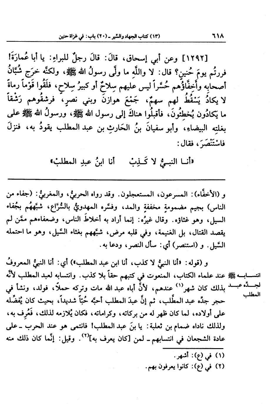 [1292] وعَن أَبِي إِسحَاقَ قَالَ: قَالَ رَجُلٌ لِلبَرَاءِ: يَا أَبَا عُمَارَةَ، فَرَرتُم يَومَ حُنَينٍ؟ قَالَ: لَا وَاللَّهِ، مَا وَلَّى رَسُولُ اللَّهِ-صَلَّى اللَّهُ عَلَيهِ وَسَلَّمَ-، وَلَكِنَّهُ خَرَجَ شُبَّانُ أَصحَابِهِ وَأَخِفَّاؤُهُم حُسَّرًا لَيسَ عَلَيهِم سِلَاحٌ، أَو كَثِيرُ سِلَاحٍ، فَلَقُوا قَومًا رُمَاةً لَا يَكَادُ يَسقُطُ لَهُم سَهمٌ، جَمعَ هَوَازِنَ وَبَنِي نَصرٍ، فَرَشَقُوهُم رَشقًا مَا يَكَادُونَ يُخطِئُونَ، فَأَقبَلُوا هُنَاكَ إِلَى رَسُولِ اللَّهِ -صَلَّى اللَّهُ عَلَيهِ وَسَلَّمَ- وَرَسُولُ اللَّهِ - صَلَّى اللَّهُ عَلَيهِ وَسَلَّمَ- عَلَى بَغلَتِهِ البَيضَاءِ، وَأَبُو سُفيَانَ بنُ الحَارِثِ بنِ عَبدِ المُطَّلِبِ يَقُودُ بِهِ، فَنَزَلَ فَاستَنصَرَ فَقَالَ: