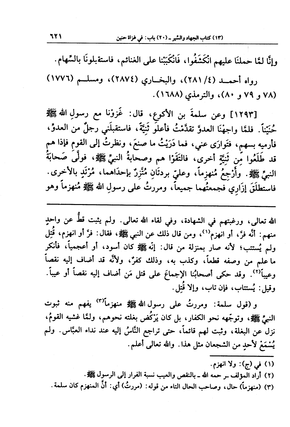[1293] وعن سَلَمَةَ بن الأكوع قَالَ: غَزَونَا مَعَ رَسُولِ اللَّهِ -صَلَّى اللَّهُ عَلَيهِ وَسَلَّمَ- حُنَينًا، فَلَمَّا وَاجَهنَا العَدُوَّ تَقَدَّمتُ فَأَعلُو ثَنِيَّةً، فَاستَقبَلَنِي رَجُلٌ مِن العَدُوِّ فَأَرمِيهِ بِسَهمٍ، فَتَوَارَى عَنِّي، فَمَا دَرَيتُ مَا صَنَعَ، وَنَظَرتُ إِلَى القَومِ فَإِذَا هُم قَد طَلَعُوا مِن ثَنِيَّةٍ أُخرَى، فَالتَقَوا هُم وَصَحَابَةُ النَّبِيِّ-صَلَّى اللَّهُ عَلَيهِ وَسَلَّمَ-، فَوَلَّى صَحَابَةُ النَّبِيِّ-صَلَّى اللَّهُ عَلَيهِ وَسَلَّمَ-، وَأَرجِعُ مُنهَزِمًا، وَعَلَيَّ بُردَتَانِ مُتَّزِر بِإِحدَاهُمَا، مُرتَد بِالأُخرَى، فَاستَطلَقَ إِزَارِي، فَجَمَعتُهُمَا جَمِيعًا، وَمَرَرتُ عَلَى رَسُولِ اللَّهِ -صَلَّى اللَّهُ عَلَيهِ وَسَلَّمَ- مُنهَزِمًا، وَهُوَ