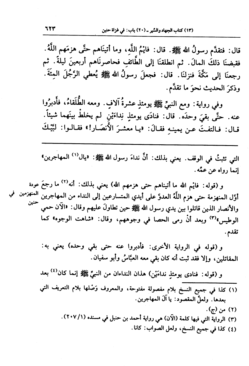 وفي رواية: وَمَعَ النَّبِيِّ -صَلَّى اللَّهُ عَلَيهِ وَسَلَّمَ- يَومَئِذٍ عَشَرَةُ آلَافٍ، وَمَعَهُ الطُّلَقَاءُ فَأَدبَرُوا عَنهُ حَتَّى بَقِيَ وَحدَهُ قَالَ: فَنَادَى يَومَئِذٍ نِدَاءَينِ لَم يَخلِط بَينَهُمَا شَيئًا قَالَ: فَالتَفَتَ عَن يَمِينِهِ فَقَالَ: يَا مَعشَرَ الأَنصَارِ! فَقَالُوا: لَبَّيكَ