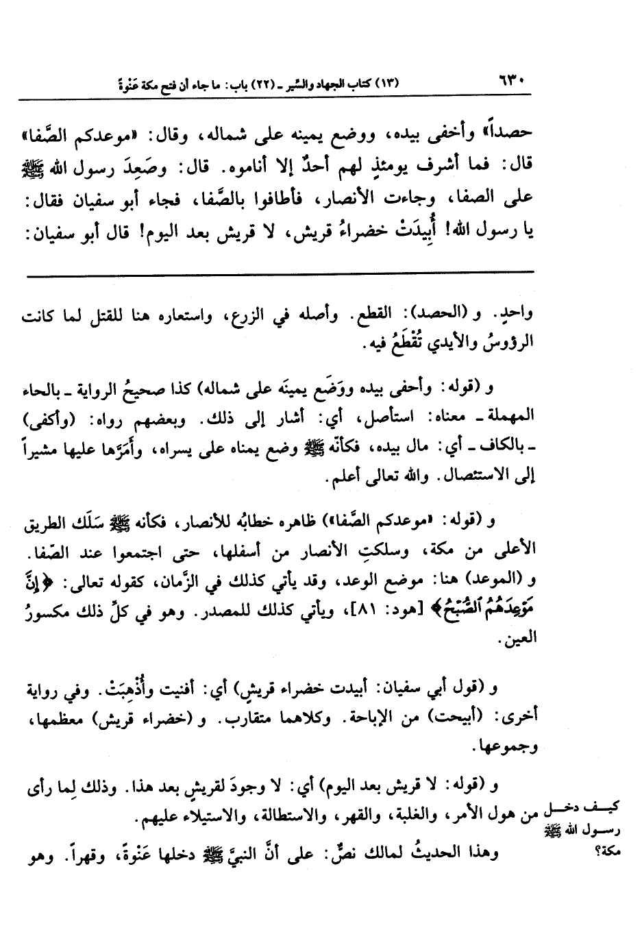 وقول أبي سفيان: (أبيدت خضراء قريش)؛ أي: أفنيت وأذهبت. وفي رواية أخرى: (أبيحت) من الإباحة. وكلاهما متقارب. و (خضراء قريش) معظمها، وجموعها.