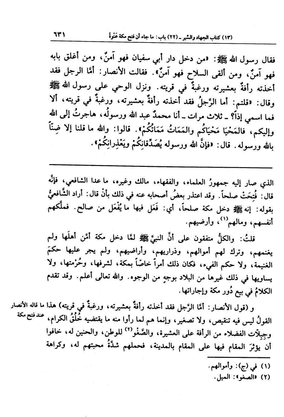 قلت: والكل متفقون على أن النبي -صلى الله عليه وسلم- لما دخل مكة أمن أهلها ولم يغنمهم، وترك لهم أموالهم، وذراريهم، وأراضيهم، ولم يجر عليها حكم الغنيمة، ولا حكم الفيء، فكان ذلك أمرًا خاصًّا بمكة، لشرفها، وحرمتها، ولا يساويها في ذلك غيرها من البلاد بوجه من الوجوه. والله تعالى أعلم. وقد تقدم الكلام في بيع دور مكة وإجاراتها.