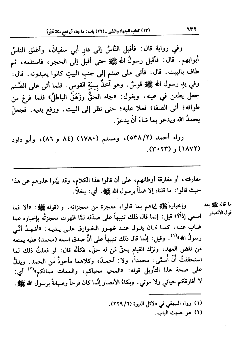 وَفِي رِوَايَةٍ: قَالَ: فَأَقبَلَ النَّاسُ إِلَى دَارِ أَبِي سُفيَانَ، وَأَغلَقَ النَّاسُ أَبوَابَهُم، قَالَ: فأَقبَلَ رَسُولُ اللَّهِ-صَلَّى اللَّهُ عَلَيهِ وَسَلَّمَ- حَتَّى أَقبَلَ إِلَى الحَجَرِ فَاستَلَمَهُ، ثُمَّ طَافَ بِالبَيتِ، قَالَ: فَأَتَى عَلَى صَنَمٍ إِلَى جَنبِ البَيتِ كَانُوا يَعبُدُونَهُ، قَالَ: وَفِي يَدِ رَسُولِ اللَّهِ-صَلَّى اللَّهُ عَلَيهِ وَسَلَّمَ- قَوسٌ. وَهُوَ آخِذٌ بِسِيَةِ القَوسِ، فَلَمَّا أَتَى عَلَى الصَّنَمِ جَعَلَ يَطعُنُ فِي عَينِهِ وَيَقُولُ: جَاءَ الحَقُّ وَزَهَقَ البَاطِلُ فَلَمَّا فَرَغَ مِن طَوَافِهِ أَتَى الصَّفَا، فَعَلَا عَلَيهِ حَتَّى نَظَرَ إِلَى البَيتِ، وَرَفَعَ يَدَيهِ فَجَعَلَ يَحمَدُ اللَّهَ وَيَدعُو بِمَا شَاءَ أَن يَدعُوَ.