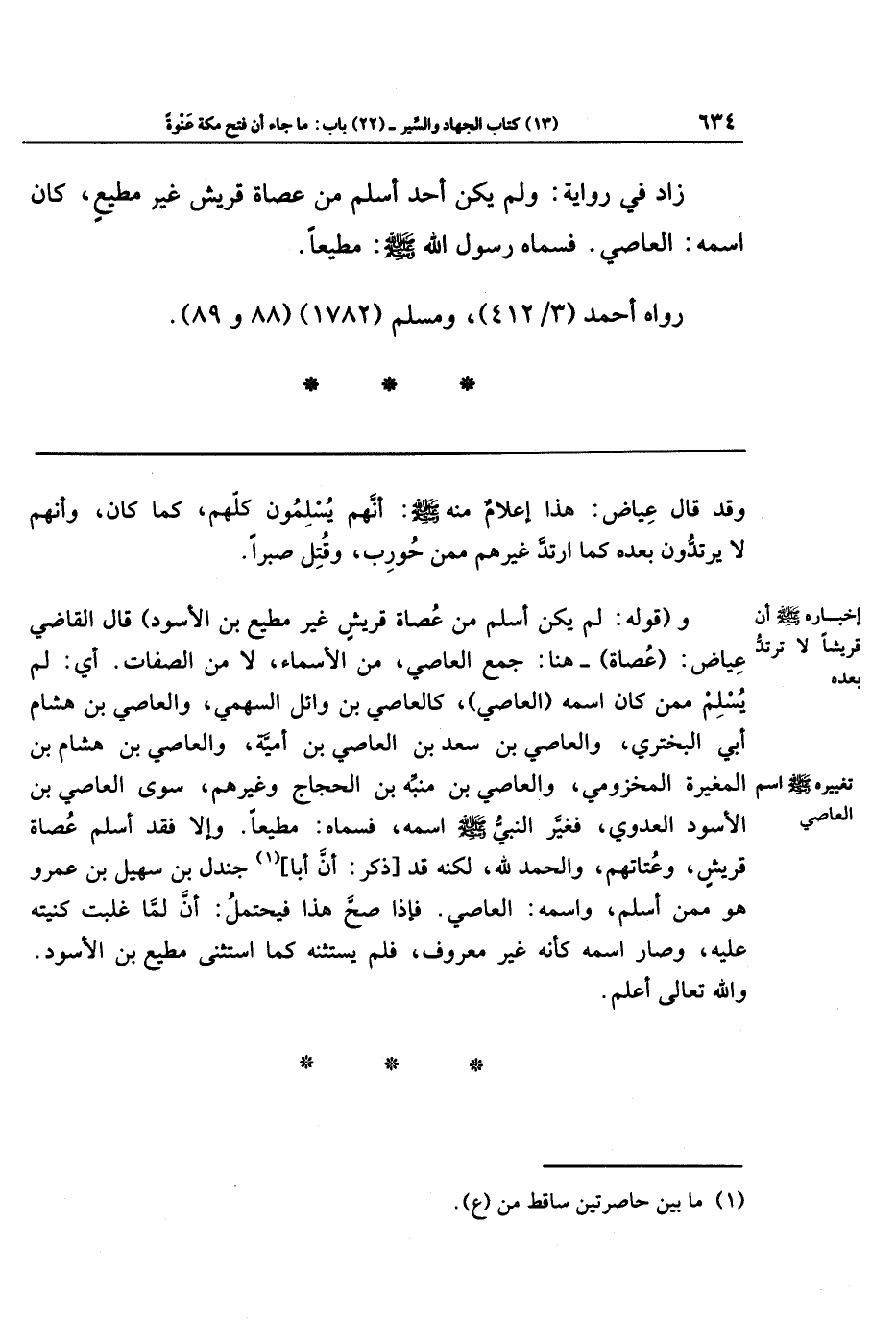 زَادَ فِي رِوَايَةٍ: وَلَم يَكُن أَحَدٌ أَسلَمَ مِن عُصَاةِ قُرَيشٍ غَيرَ مُطِيعٍ، كَانَ اسمُهُ العَاصِي، فَسَمَّاهُ رَسُولُ اللَّهِ-صَلَّى اللَّهُ عَلَيهِ وَسَلَّمَ- مُطِيعًا.