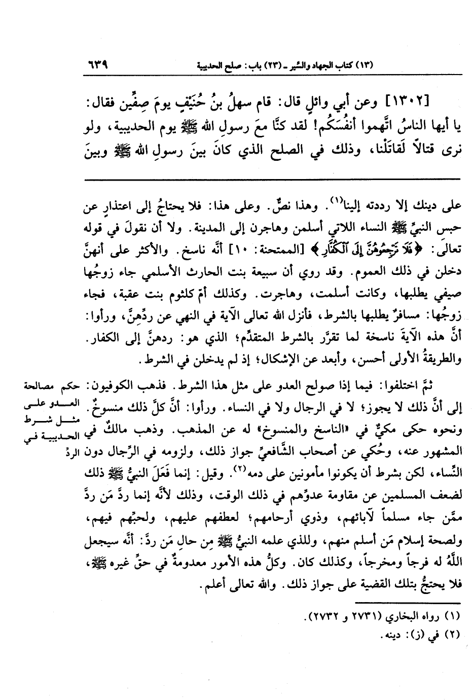 [1302] وعَن أَبِي وَائِلٍ قَالَ: قَامَ سَهلُ بنُ حُنَيفٍ يَومَ صِفِّينَ فَقَالَ: يا أَيُّهَا النَّاسُ، اتَّهِمُوا أَنفُسَكُم، لَقَد كُنَّا مَعَ رَسُولِ اللَّهِ-صَلَّى اللَّهُ عَلَيهِ وَسَلَّمَ- يَومَ الحُدَيبِيَةِ، وَلَو نَرَى قِتَالًا لَقَاتَلنَا. وَذَلِكَ فِي الصُّلحِ الَّذِي كَانَ بَينَ رَسُولِ اللَّهِ -صَلَّى اللَّهُ عَلَيهِ وَسَلَّمَ- وَبَينَ