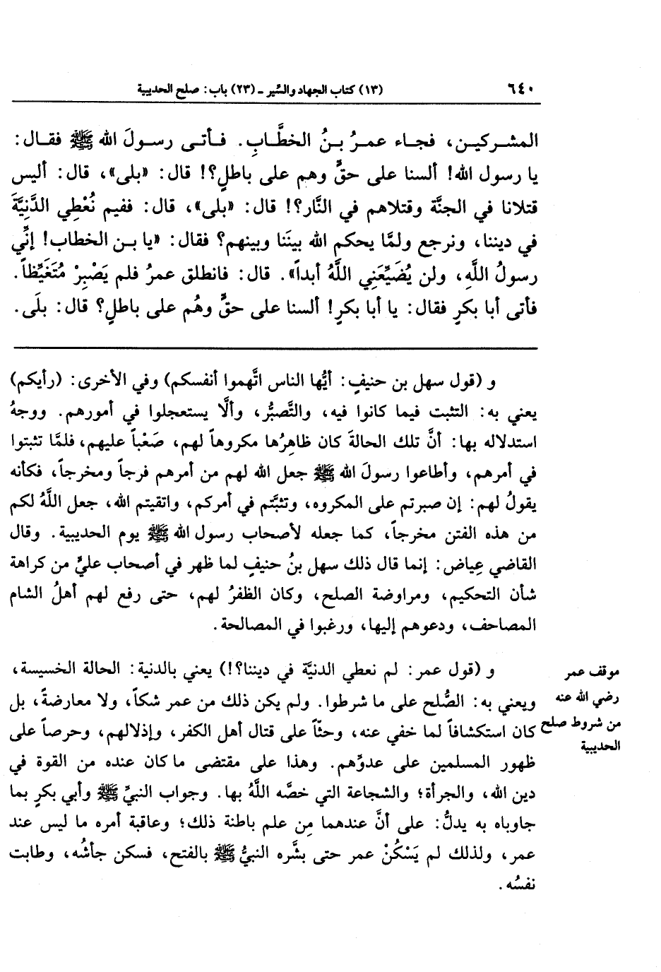 المُشرِكِينَ، فَجَاءَ عُمَرُ بنُ الخَطَّابِ، فَأَتَى رَسُولَ اللَّهِ -صَلَّى اللَّهُ عَلَيهِ وَسَلَّمَ- فَقَالَ: يَا رَسُولَ اللَّهِ، أَلَسنَا عَلَى حَقٍّ وَهُم عَلَى بَاطِلٍ؟ قَالَ: بَلَى. قَالَ: أَلَيسَ قَتلَانَا فِي الجَنَّةِ وَقَتلَاهُم فِي النَّارِ؟ قَالَ: بَلَى. قَالَ: ففيم نُعطِي الدَّنِيَّةَ فِي دِينِنَا؟ وَنَرجِعُ وَلَمَّا يَحكُمِ اللَّهُ بَينَنَا وَبَينَهُم؟ فقال: يَا بنَ الخَطَّابِ، إِنِّي رَسُولُ اللَّهِ، وَلَن يُضَيِّعَنِي اللَّهُ أَبَدًا. قَالَ: فَانطَلَقَ عُمَرُ فَلَم يَصبِر مُتَغَيِّظًا، فَأَتَى أَبَا بَكرٍ فَقَالَ: يَا أَبَا بَكرٍ، أَلَسنَا عَلَى حَقٍّ وَهُم عَلَى بَاطِلٍ؟ قَالَ: بَلَى.
