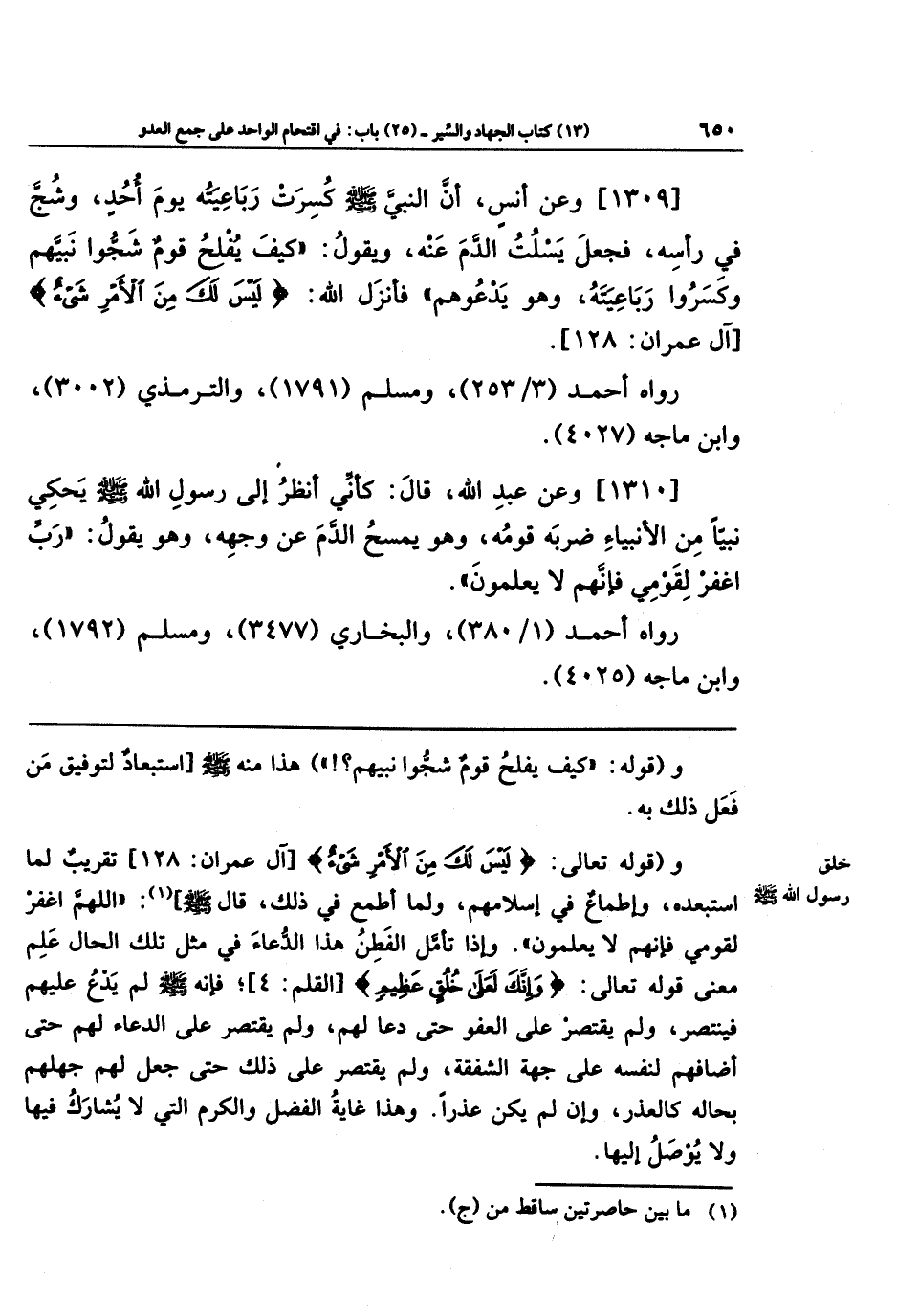 [1310] وعَن عَبدِ اللَّهِ قَالَ: كَأَنِّي أَنظُرُ إِلَى رَسُولِ اللَّهِ -صَلَّى اللَّهُ عَلَيهِ وَسَلَّمَ- يَحكِي نَبِيًّا مِن الأَنبِيَاءِ، ضَرَبَهُ قَومُهُ، وَهُوَ يَمسَحُ الدَّمَ عَن وَجهِهِ، وَهو يَقُولُ: رَبِّ اغفِر لِقَومِي فَإِنَّهُم لَا يَعلَمُونَ.
