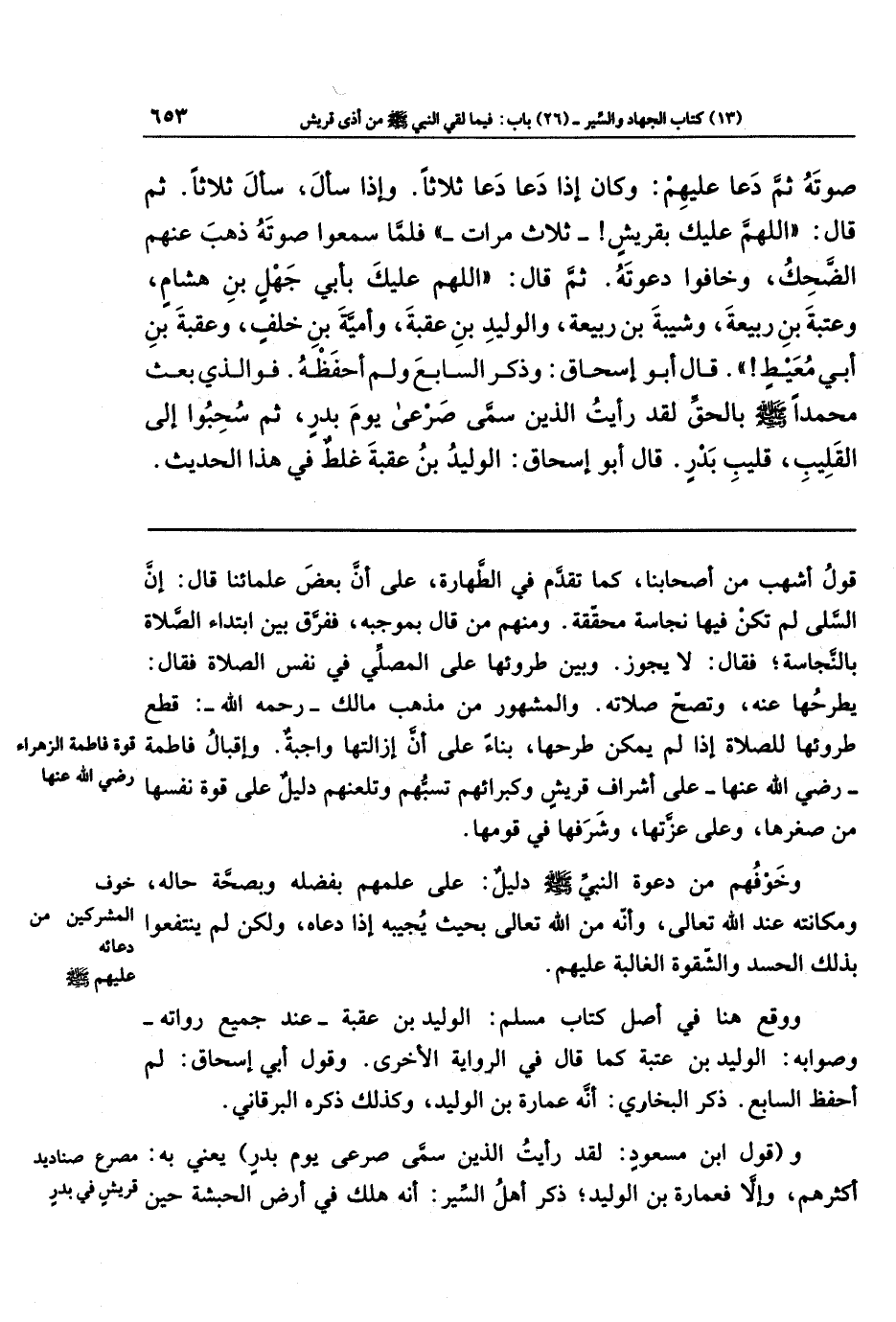 قول أشهب من أصحابنا، كما تقدَّم في الطهارة، على أن بعض علمائنا قال: إن السَّلى لم تكن فيها نجاسة محققة. ومنهم من قال بموجبه، ففرَّق بين ابتداء الصلاة بالنجاسة؛ فقال: لا يجوز. وبيّن طروئها على المصلي في نفس الصلاة فقال: يطرحها عنه، وتصح صلاته، والمشهور من مذهب مالك - رحمه الله -: قطع طروئها للصلاة إذا لم يمكن طرحها، بناءً على أن إزالتها واجبة. وإقبال فاطمة رضي الله عنها على أشراف قريش وكبرائهم تسبُّهم وتلعنهم دليل على قوة نفسها من صغرها، وعلى عزتها وشرفها في قومها.