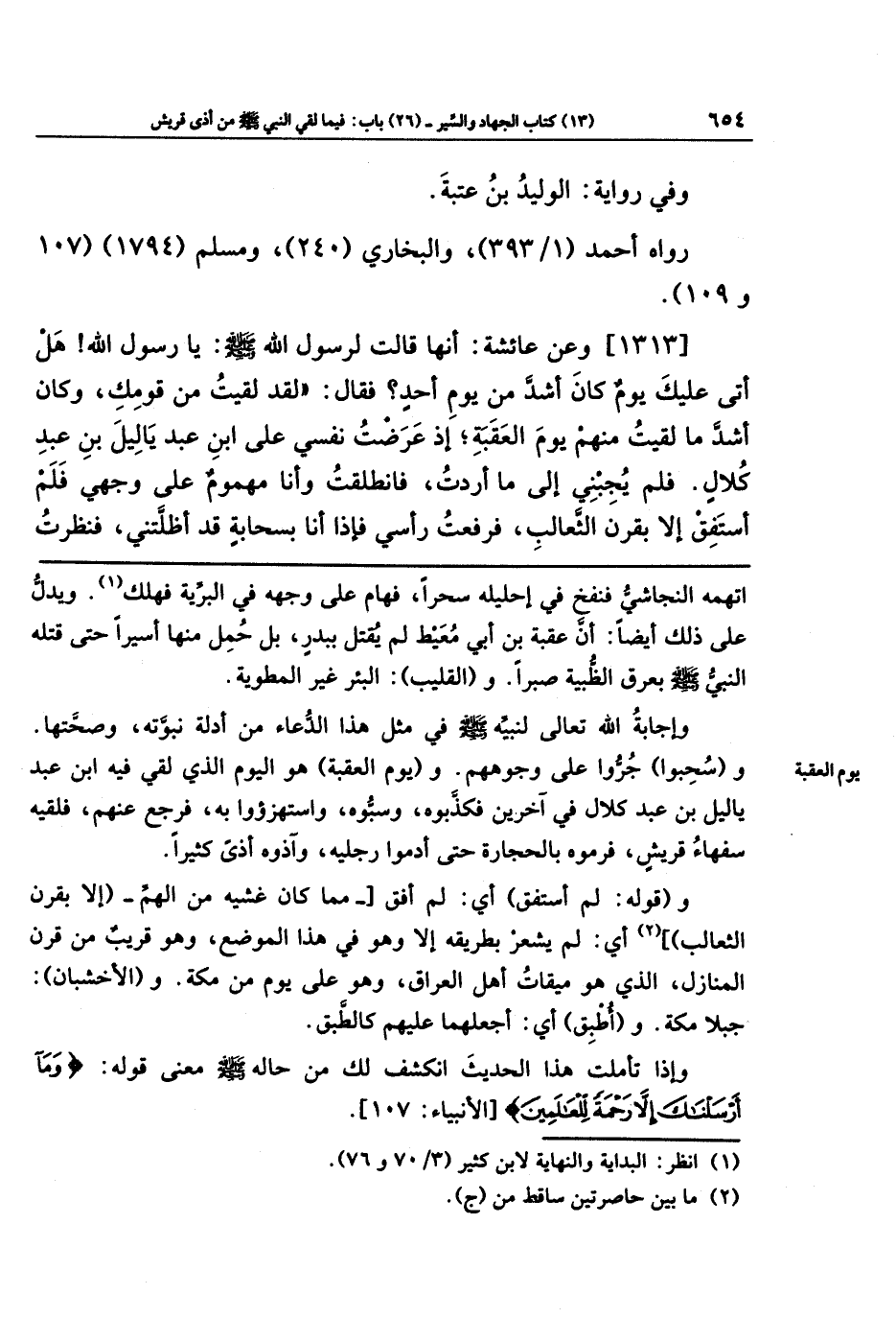 [1313] وعن عَائِشَةَ: أَنَّهَا قَالَت لِرَسُولِ اللَّهِ-صَلَّى اللَّهُ عَلَيهِ وَسَلَّمَ-: يَا رَسُولَ اللَّهِ، هَل أَتَى عَلَيكَ يَومٌ كَانَ أَشَدَّ مِن يَومِ أُحُدٍ؟ فَقَالَ: لَقَد لَقِيتُ مِن قَومِكِ، وَكَانَ أَشَدَّ مَا لَقِيتُ مِنهُم يَومَ العَقَبَةِ، إِذ عَرَضتُ نَفسِي عَلَى ابنِ عَبدِ يَالِيلَ بنِ عَبدِ كُلَالٍ، فَلَم يُجِبنِي إِلَى مَا أَرَدتُ، فَانطَلَقتُ وَأَنَا مَهمُومٌ عَلَى وَجهِي، فَلَم أَستَفِق إِلَّا بِقَرنِ الثَّعَالِبِ، فَرَفَعتُ رَأسِي فَإِذَا أَنَا بِسَحَابَةٍ قَد أَظَلَّتنِي، فَنَظَرتُ