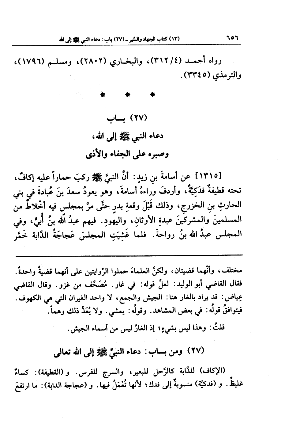 [1315] عن أُسَامَةَ بنَ زَيدٍ: أَنَّ النَّبِيَّ -صَلَّى اللَّهُ عَلَيهِ وَسَلَّمَ- رَكِبَ حِمَارًا عَلَيهِ إِكَافٌ، تَحتَهُ قَطِيفَةٌ فَدَكِيَّةٌ، وَأَردَفَ وَرَاءَهُ أُسَامَةَ، وَهُوَ يَعُودُ سَعدَ بنَ عُبَادَةَ فِي بَنِي الحَارِثِ بنِ الخَزرَجِ، وَذَلكَ قَبلَ وَقعَةِ بَدرٍ، حَتَّى مَرَّ بِمَجلِسٍ فِيهِ أَخلَاطٌ مِن المُسلِمِينَ وَالمُشرِكِينَ عَبَدَةِ الأَوثَانِ وَاليَهُودِ، فِيهِم عَبدُ اللَّهِ بنُ أُبَيٍّ، وَفِي المَجلِسِ عَبدُ اللَّهِ بنُ رَوَاحَةَ، فَلَمَّا غَشِيَت المَجلِسَ عَجَاجَةُ الدَّابَّةِ، خَمَّرَ