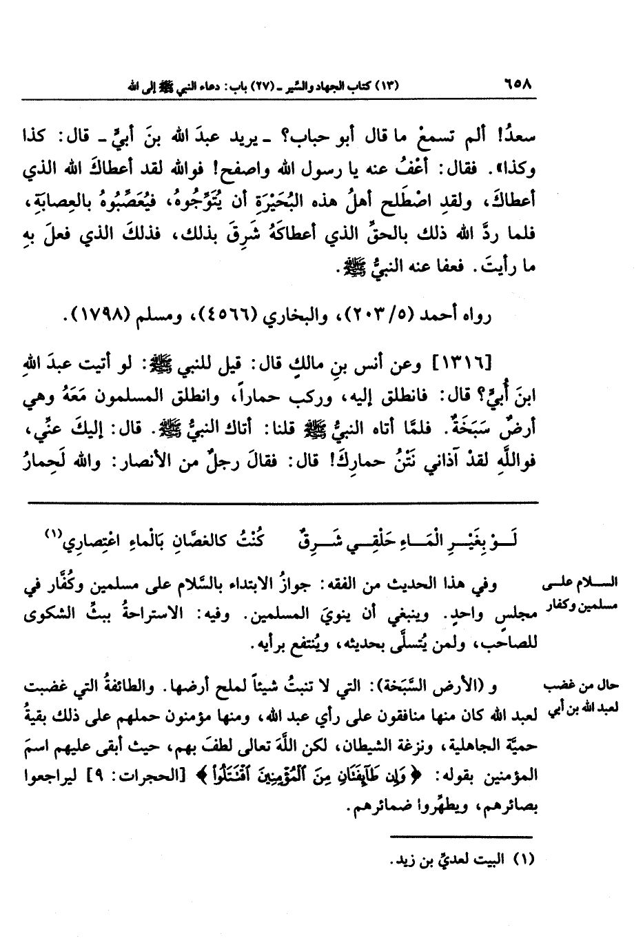 [1316] وعَن أَنَسِ بنِ مَالِكٍ قَالَ: قِيلَ لِلنَّبِيِّ-صَلَّى اللَّهُ عَلَيهِ وَسَلَّمَ-: لَو أَتَيتَ عَبدَ اللَّهِ بنَ أُبَيٍّ؟ قَالَ: فَانطَلَقَ إِلَيهِ وَرَكِبَ حِمَارًا، وَانطَلَقَ المُسلِمُونَ معه وَهِيَ أَرضٌ سَبَخَةٌ، فَلَمَّا أَتَاهُ النَّبِيُّ -صَلَّى اللَّهُ عَلَيهِ وَسَلَّمَ- قلنا: أَتَاكَ النَّبِيُّ -صَلَّى اللَّهُ عَلَيهِ وَسَلَّمَ- قَالَ: إِلَيكَ عَنِّي، فَوَاللَّهِ لَقَد آذَانِي نَتنُ حِمَارِكَ. قَالَ: فَقَالَ رَجُلٌ مِن الأَنصَارِ: وَاللَّهِ لَحِمَارُ