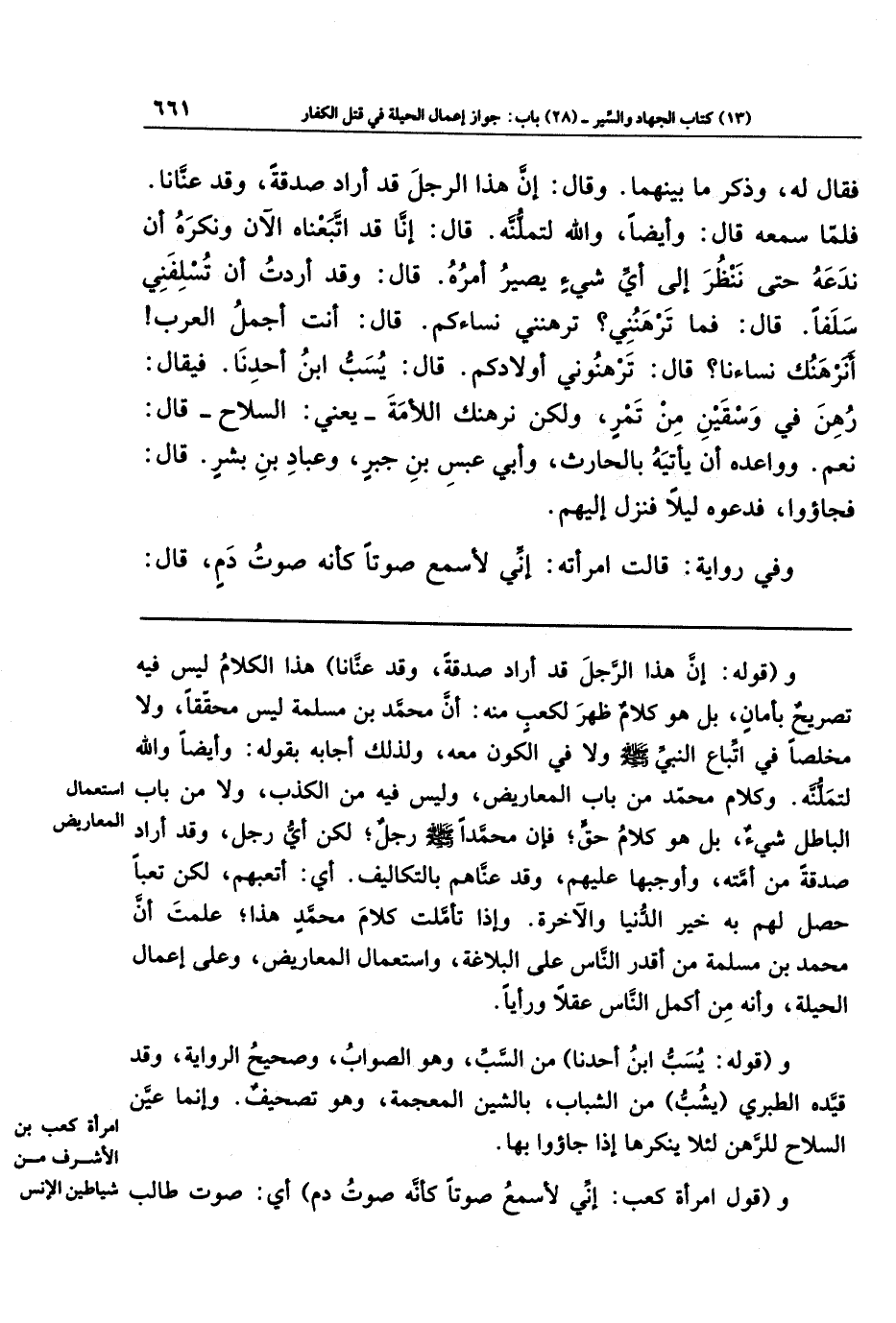 فَقَالَ لَهُ، وَذَكَرَ مَا بَينَهُمَا، وَقَالَ: إِنَّ هَذَا الرَّجُلَ قَد أَرَادَ صَدَقَةً، وَقَد عَنَّانَا، فَلَمَّا سَمِعَهُ قَالَ: وَأَيضًا وَاللَّهِ لَتَمَلُّنَّهُ، قَالَ: إِنَّا قَد اتَّبَعنَاهُ الآنَ وَنَكرَهُ أَن نَدَعَهُ حَتَّى نَنظُرَ إِلَى أَيِّ شَيءٍ يَصِيرُ أَمرُهُ، قَالَ: وَقَد أَرَدتُ أَن تُسلِفَنِي سَلَفًا، قَالَ: فَمَا تَرهَنُنِي؟ تَرهَنُنِي نِسَاءَكُم، قَالَ: أَنتَ أَجمَلُ العَرَبِ، أَنَرهَنُكَ نِسَاءَنَا؟ قَالَ: تَرهَنُونِي أَولَادَكُم، قَالَ: يُسَبُّ ابنُ أَحَدِنَا فَيُقَالَ: رُهِنَ فِي وَسقَينِ مِن تَمرٍ، وَلَكِن نَرهَنُكَ اللَّأمَةَ. (يَعنِي السِّلَاحَ) قَالَ: نَعَم. وَوَاعَدَهُ أَن يَأتِيَهُ بِالحَارِثِ، وَأَبِي عَبسِ بنِ جَبرٍ، وَعَبَّادِ بنِ بِشرٍ، قَالَ: فَجَاؤوا فَدَعَوهُ لَيلًا، فَنَزَلَ إِلَيهِم.