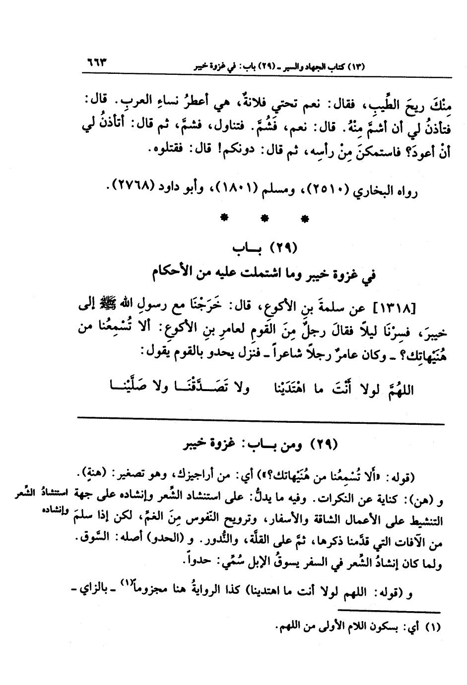 [1318] عَن سَلَمَةَ بنِ الأَكوَعِ قَالَ: خَرَجنَا مَعَ رَسُولِ اللَّهِ -صَلَّى اللَّهُ عَلَيهِ وَسَلَّمَ- إِلَى خَيبَرَ، فَسرنَا لَيلًا، فَقَالَ رَجُلٌ مِن القَومِ لِعَامِرِ بنِ الأَكوَعِ: أَلَا تُسمِعُنَا مِن هُنَيهَاتِكَ؟ -وَكَانَ عَامِرٌ رَجُلًا شَاعِرًا- فَنَزَلَ يَحدُو بِالقَومِ يَقُولُ: