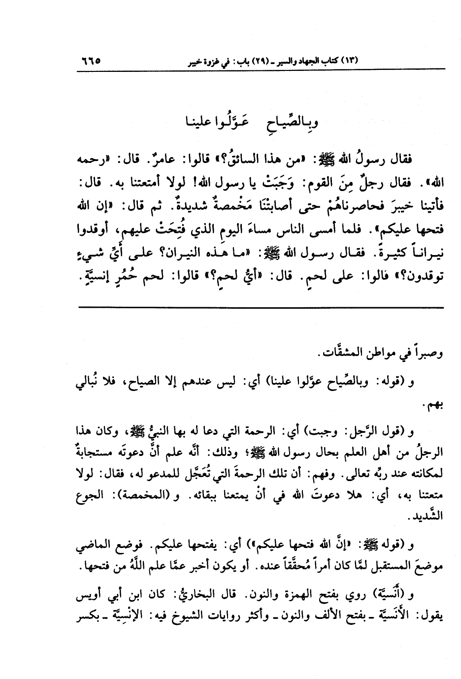 فَقَالَ رَسُولُ اللَّهِ-صَلَّى اللَّهُ عَلَيهِ وَسَلَّمَ-: مَن هَذَا السَّائِقُ؟ قَالَوا: عَامِرٌ، قَالَ: رَحِمَهُ اللَّهُ. فَقَالَ رَجُلٌ مِن القَومِ: وَجَبَت يَا رَسُولَ اللَّهِ، لَولَا أَمتَعتَنَا بِهِ؟ قَالَ: فَأَتَينَا خَيبَرَ فَحَاصَرنَاهُم حَتَّى أَصَابَتنَا مَخمَصَةٌ شَدِيدَةٌ، ثُمَّ قَالَ: إِنَّ اللَّهَ فَتَحَهَا عَلَيكُم. قَالَ: فَلَمَّا أَمسَى النَّاسُ مَسَاءَ اليَومِ الَّذِي فُتِحَت عَلَيهِم، أَوقَدُوا نِيرَانًا كَثِيرَةً، فَقَالَ رَسُولُ اللَّهِ-صَلَّى اللَّهُ عَلَيهِ وَسَلَّمَ-: مَا هَذِهِ النِّيرَانُ؟ عَلَى أَيِّ شَيءٍ تُوقِدُونَ؟ قَالَوا: عَلَى لَحمٍ، قَالَ: أَيُّ لَحمٍ؟ قَالَوا: لَحمُ حُمُرِ إِنسِيَّةِ،