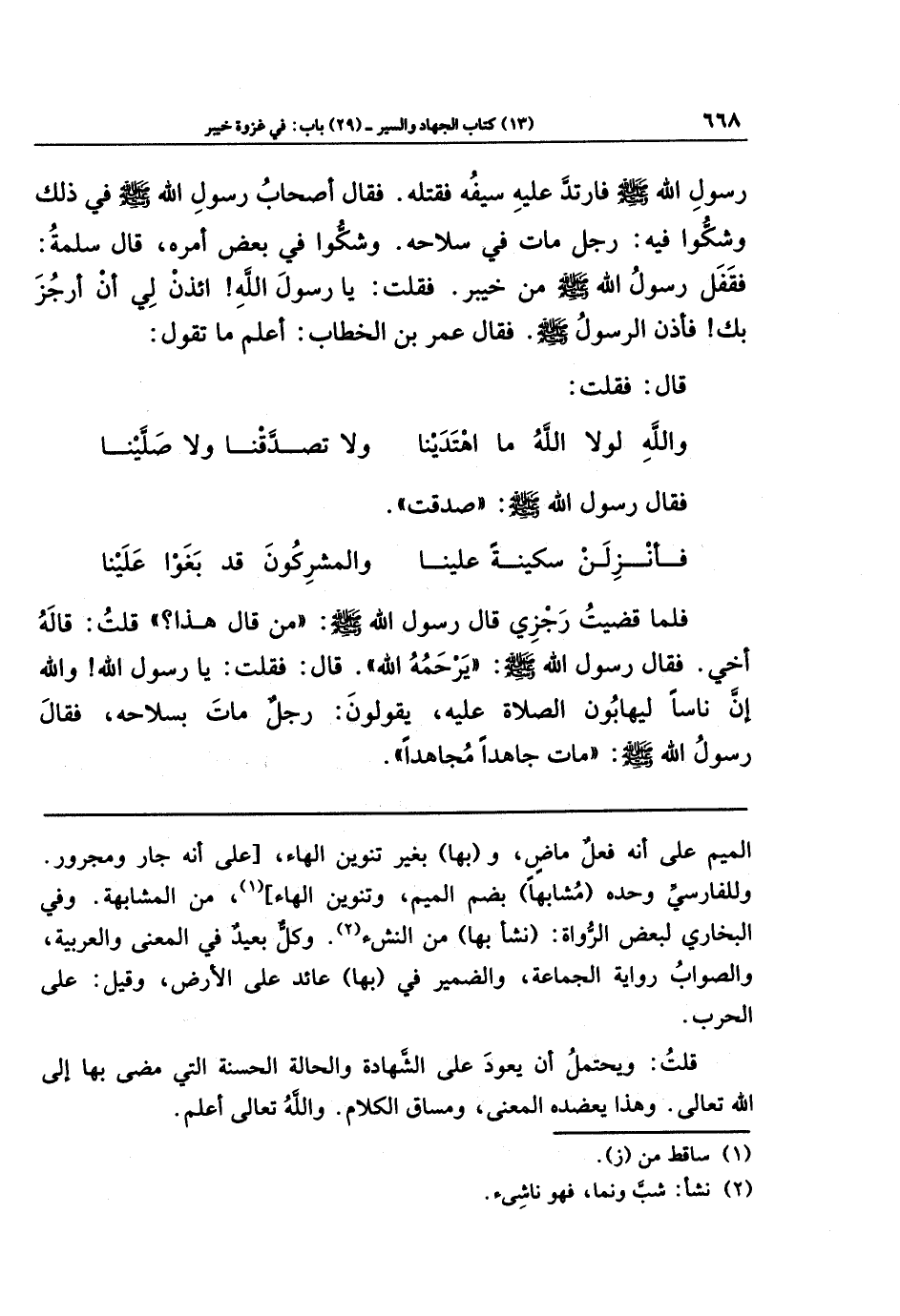 رَسُولِ اللَّهِ-صَلَّى اللَّهُ عَلَيهِ وَسَلَّمَ-، فَارتَدَّ عَلَيهِ سَيفُهُ فَقَتَلَهُ، فَقَالَ أَصحَابُ رَسُولِ اللَّهِ -صَلَّى اللَّهُ عَلَيهِ وَسَلَّمَ- فِي ذَلِكَ، وَشَكُّوا فِيهِ: رَجُلٌ مَاتَ فِي سِلَاحِهِ، وَشَكُّوا فِي بَعضِ أَمرِهِ، قَالَ سَلَمَةُ: فَقَفَلَ رَسُولُ اللَّهِ -صَلَّى اللَّهُ عَلَيهِ وَسَلَّمَ- مِن خَيبَرَ. فَقُلتُ: يَا رَسُولَ اللَّهِ! ائذَن لِي أَن أَرجُزَ بَكَ، فَأَذِنَ الرَسُولُ - صَلَّى اللَّهُ عَلَيهِ وَسَلَّمَ-، فَقَالَ عُمَرُ بنُ الخَطَّابِ: أَعلَمُ مَا تَقُولُ، قَالَ: فَقُلتُ: