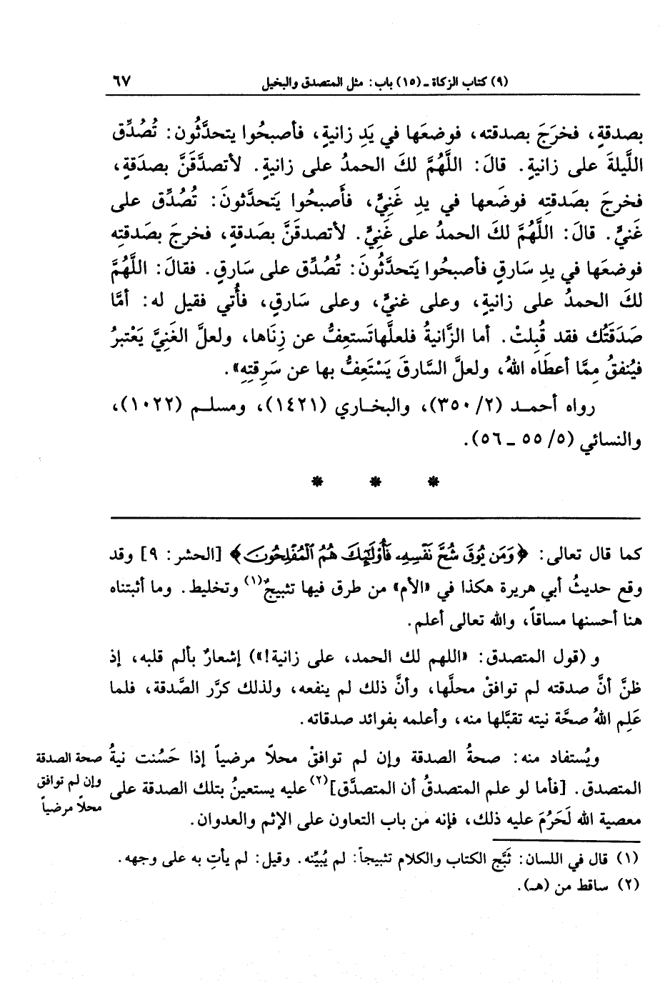 بِصَدَقَةٍ، فَخَرَجَ بِصَدَقَتِهِ، فَوَضَعَهَا فِي يَدِ زَانِيَةٍ فَأَصبَحُوا يَتَحَدَّثُونَ: تُصُدِّقَ اللَّيلَةَ عَلَى زَانِيَةٍ. قَالَ: اللهُمَّ لك الحَمدُ عَلَى زَانِيَةٍ. لأَتَصَدَّقَنَّ بِصَدَقَةٍ، فَخَرَجَ بِصَدَقَتِهِ فَوَضَعَهَا فِي يَدِ غَنِيٍّ، فَأَصبَحُوا يَتَحَدَّثُونَ: تُصُدِّقَ عَلَى غَنِيٍّ قَالَ: اللهُمَّ لك الحَمدُ عَلَى غَنِيٍّ. لأَتَصَدَّقَنَّ بِصَدَقَةٍ، فَخَرَجَ بِصَدَقَتِهِ فَوَضَعَهَا فِي يَدِ سَارِقٍ فَأَصبَحُوا يَتَحَدَّثُونَ: تُصُدِّقَ عَلَى سَارِقٍ. فَقَالَ: اللهُمَّ لك الحَمدُ عَلَى زَانِيَةٍ، وَعَلَى غَنِيٍّ، وَعَلَى سَارِقٍ، فَأُتِيَ فَقِيلَ لَهُ: أَمَّا صَدَقَتُكَ فَقَد قُبِلَت، أَمَّا الزَّانِيَةُ فَلَعَلَّهَا تَستَعِفُّ عَن زِنَاهَا، وَلَعَلَّ الغَنِيَّ يَعتَبِرُ فَيُنفِقُ مِمَّا أَعطَاهُ اللهُ، وَلَعَلَّ السَّارِقَ يَستَعِفُّ بِهَا عَن سَرِقَتِهِ).