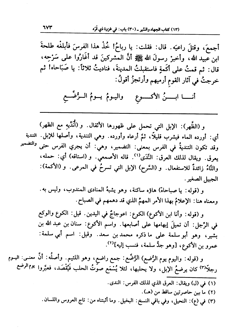أَجمَعَ، وَقَتَلَ رَاعِيَهُ قَالَ فَقُلتُ: يَا رَبَاحُ خُذ هَذَا الفَرَسَ فَأَبلِغهُ طَلحَةَ بنَ عُبَيدِ اللَّهِ، وَأَخبِر رَسُولَ اللَّهُ -صَلَّى اللَّهُ عَلَيهِ وَسَلَّمَ- أَنَّ المُشرِكِينَ قَد أَغَارُوا عَلَى سَرحِهِ، قَالَ: ثُمَّ قُمتُ عَلَى أَكَمَةٍ فَاستَقبَلتُ المَدِينَةَ فَنَادَيتُ ثَلَاثًا: يَا صَبَاحَاه! ثُمَّ خَرَجتُ فِي آثَارِ القَومِ أَرمِيهِم وَأَرتَجِزُ أَقُولُ: