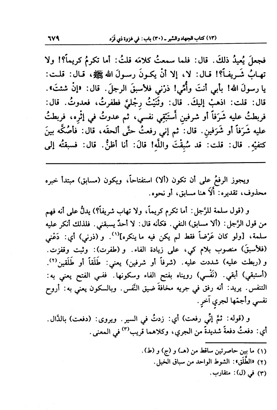 فَجَعَلَ يُعِيدُ ذَلِكَ، قَالَ: فَلَمَّا سَمِعتُ كَلَامَهُ قُلتُ: أَمَا تُكرِمُ كَرِيمًا؟ وَلَا تَهَابُ شَرِيفًا؟ قَالَ: لَا، إِلَّا أَن يَكُونَ رَسُولَ اللَّهِ - صَلَّى اللَّهُ عَلَيهِ وَسَلَّمَ-. قَالَ: قُلتُ: يَا رَسُولَ اللَّهِ! بِأَبِي وَأُمِّي ذَرنِي فَلِأُسَبِقَ الرَّجُلَ. قَالَ: إِن شِئتَ. قَالَ: قُلتُ: اذهَب إِلَيكَ، قال: وَثَنَيتُ رِجلَيَّ فَطَفَرتُ، فَعَدَوتُ، قَالَ: فَرَبَطتُ عَلَيهِ شَرَفًا أَو شَرَفَينِ، أَستَبقِي نَفَسِي، ثُمَّ عَدَوتُ فِي إِثرِهِ فَرَبَطتُ عَلَيهِ شَرَفًا أَو شَرَفَينِ، قال ثُمَّ إِنِّي رَفَعتُ حَتَّى أَلحَقَهُ، قَالَ: فَأَصُكُّهُ بَينَ كَتِفَيهِ، قَالَ: قُلتُ: قَد سُبِقتَ وَاللَّهِ، قَالَ: أَنَا أَظُنُّ، قَالَ: فَسَبَقتُهُ إِلَى
