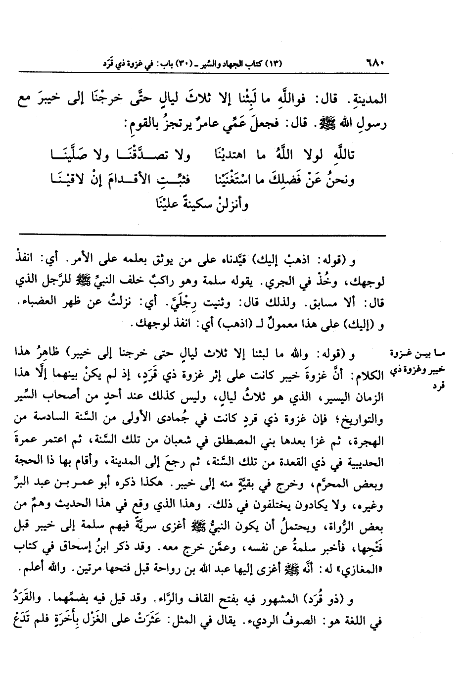 وقوله: (والله! ما لبثنا إلا ثلاث ليالٍ حتى خرجنا إلى خيبر)؛ ظاهر هذا الكلام: أن غزوة خيبر كانت على إثر غزوة ذي قرد؛ إذ لم يكن بينهما إلا هذا الزمان اليسير، الذي هو ثلاث ليال، وليس كذلك عند أحد من أصحاب السِّير والتواريخ؛ فإن غزوة ذي قرد كانت في جمادى الأولى من السَّنة السادسة من الهجرة، ثم غزا بعدها بني المصطلق في شعبان من تلك السنة، ثم اعتمر عمرة الحديبية في ذي القعدة من تلك السنة، ثم رجع إلى المدينة، وأقام بها ذا الحجَّة وبعض المحرم، وخرج في بقيةٍ منه إلى خيبر، هكذا ذكره أبو عمر بن عبد البر وغيره، ولا يكادون يختلفون في ذلك. وهذا الذي وقع في هذا الحديث وهم من بعض الرُّواة، ويحتمل أن يكون النبي -صلى الله عليه وسلم- أغزى سرية فيهم سلمة إلى خيبر قبل فتحها، فأخبر سلمة عن نفسه، وعمن خرج معه. وقد ذكر ابن إسحاق في كتاب المغازي له: أنه -صلى الله عليه وسلم- أغزى إليها عبد الله بن رواحة قبل فتحها مرتين. والله أعلم.